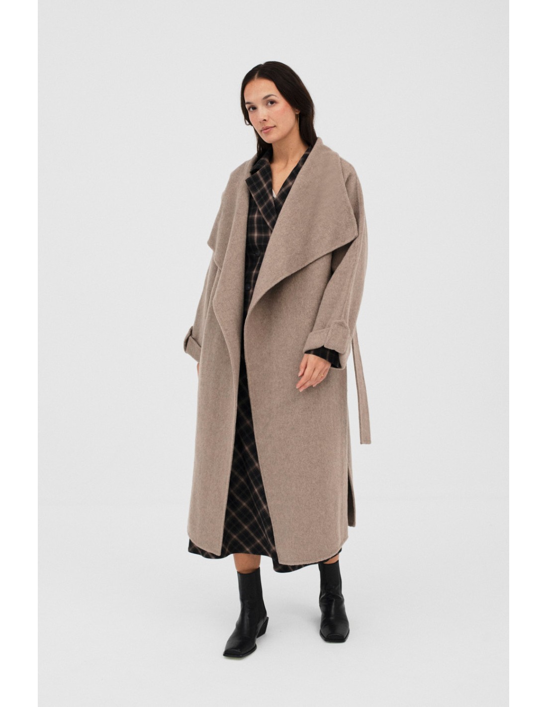 Elysses es un abrigo largo tipo envolvente, con cierre con un botón forrado en hombro y cinturón. Cuenta con dos bolsillos. Ideal para un look elegante y cómodo.