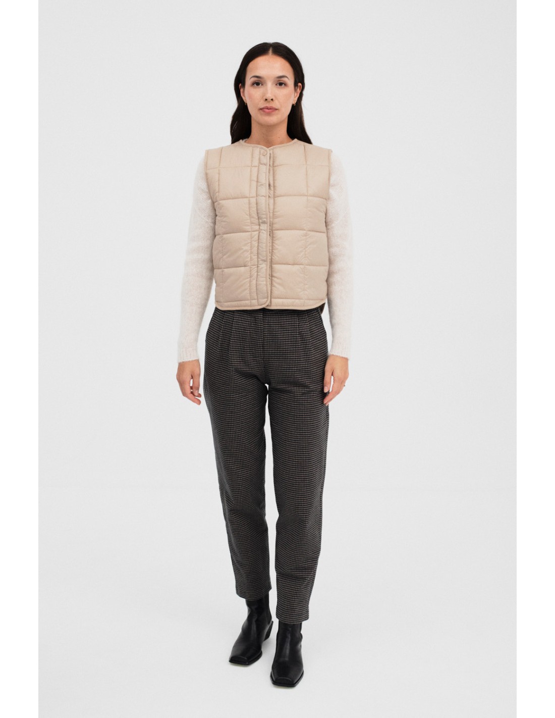 Chaleco acolchado con diseño moderno, bolsillos discretos en los lados y cierre a presión con botones. Ligero y versátil, ideal para elevar cualquier look. Combina con el bolso Corts.