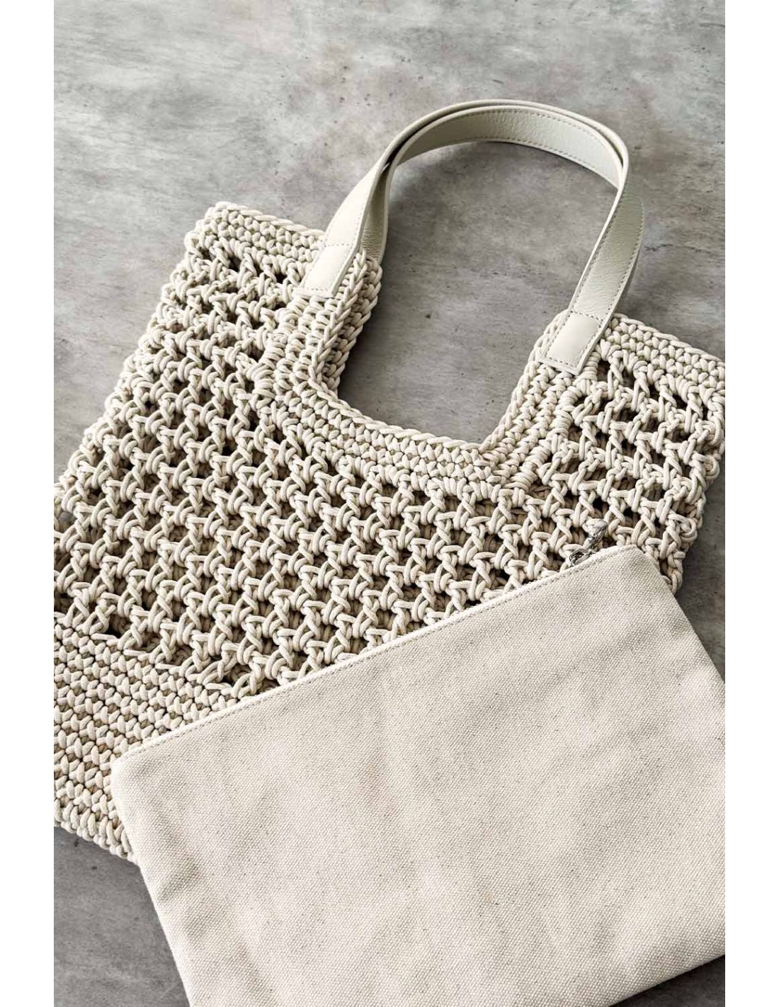 Bolso tote de crochet con asas de cuero y neceser interior con cremallera metálica.