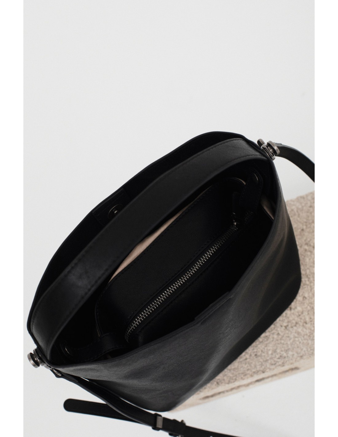 Bolso de piel con asas corta y larga y cierre con imán. En el interior, neceser extraíble de tejido y piel con logo de Mus&Bombon grabado, el logo también está en el exterior del bolso.