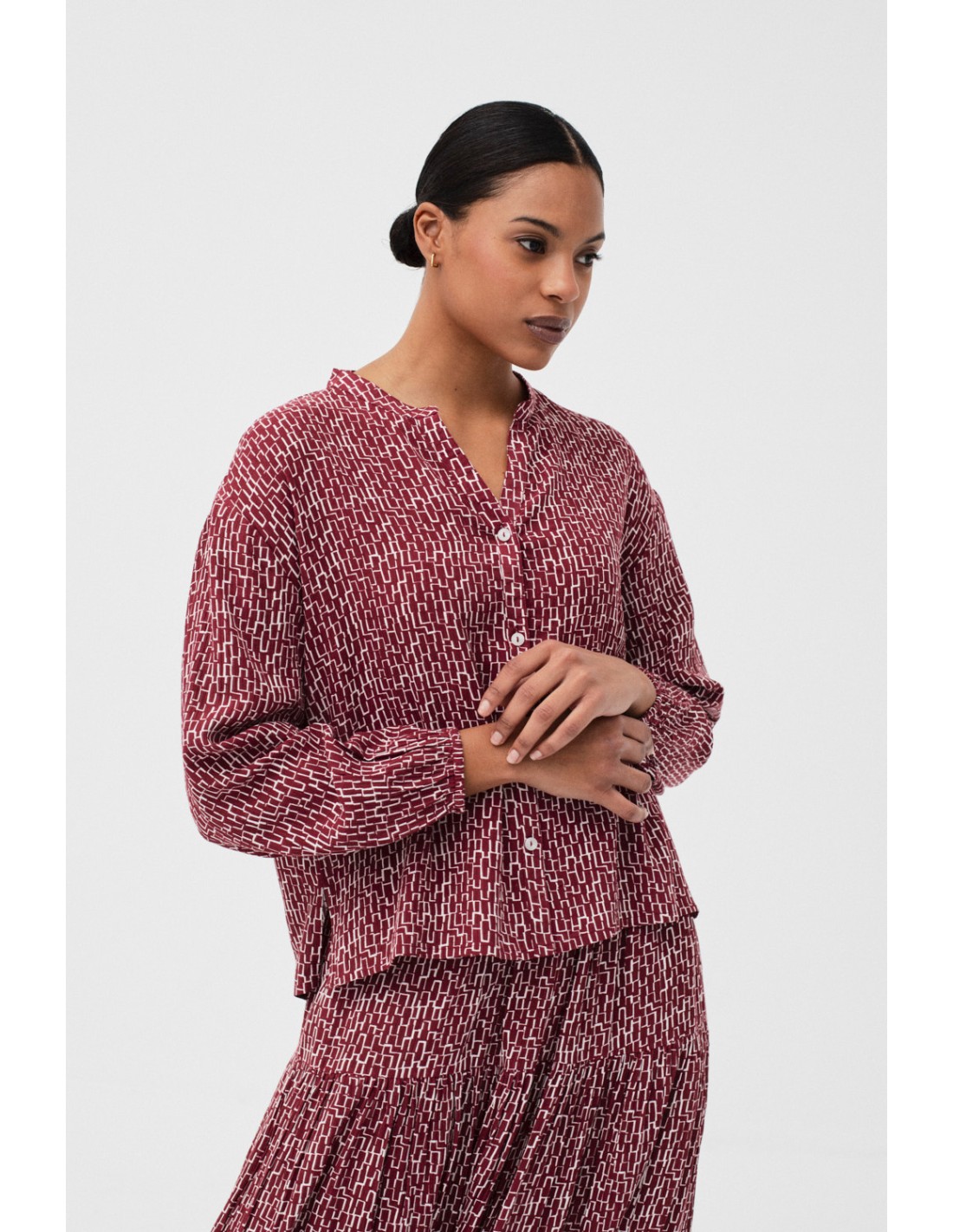 Annex es una camisa estampada con cuello mao, mangas abullonadas y botonadura frontal. Combínala con la falda Arrayan para un total look.