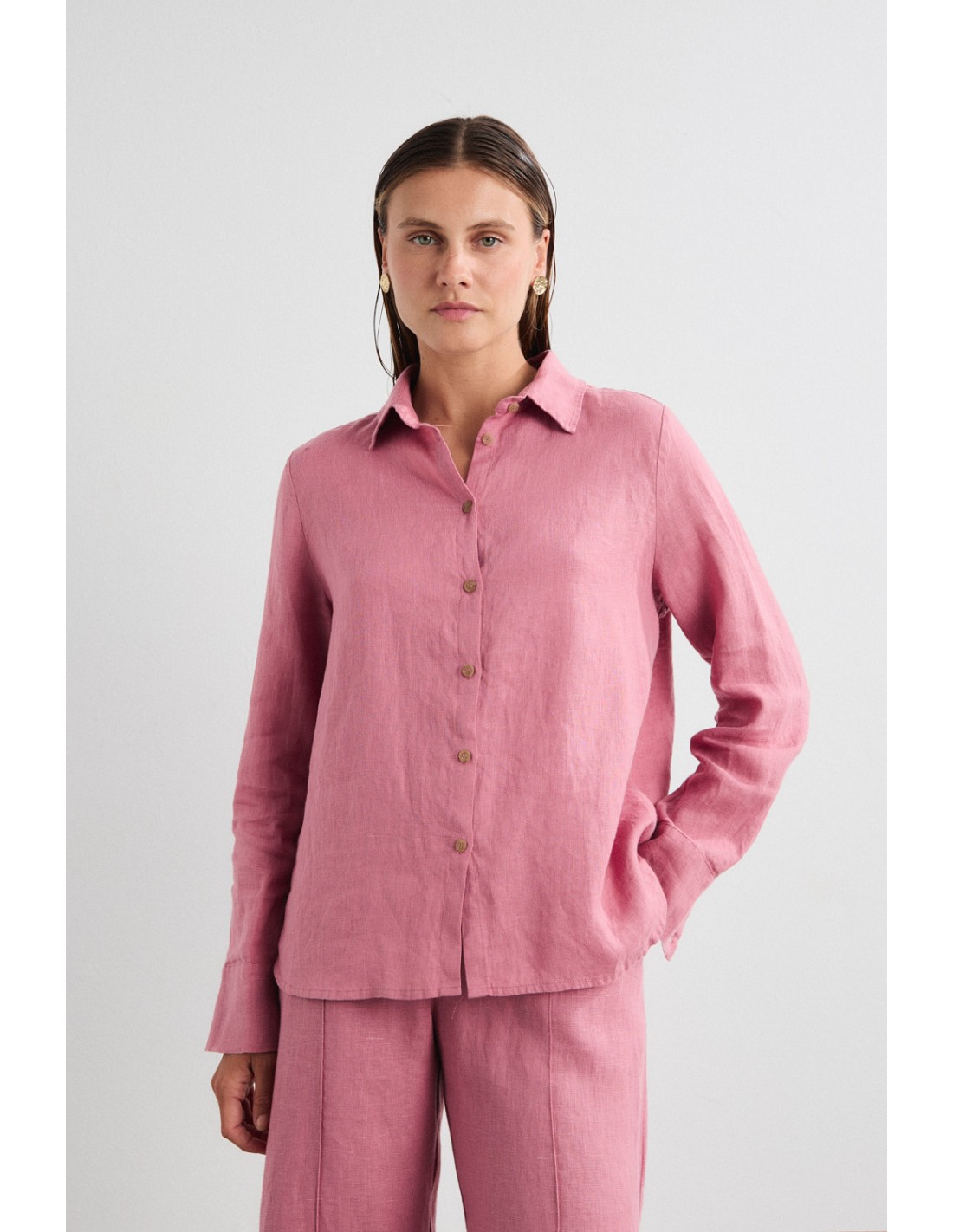 Camisa básica de lino con cuello camisero, botonadura frontal, puños con botón, canesú en la espalda y pliegue central. Incluye un botón oculto en la costura lateral que permite llevarla cruzada, ofreciendo una silueta versátil y sofisticada. Combínala con los pantalones Aurora. También disponible el vestido de lino Aurora en la misma familia.