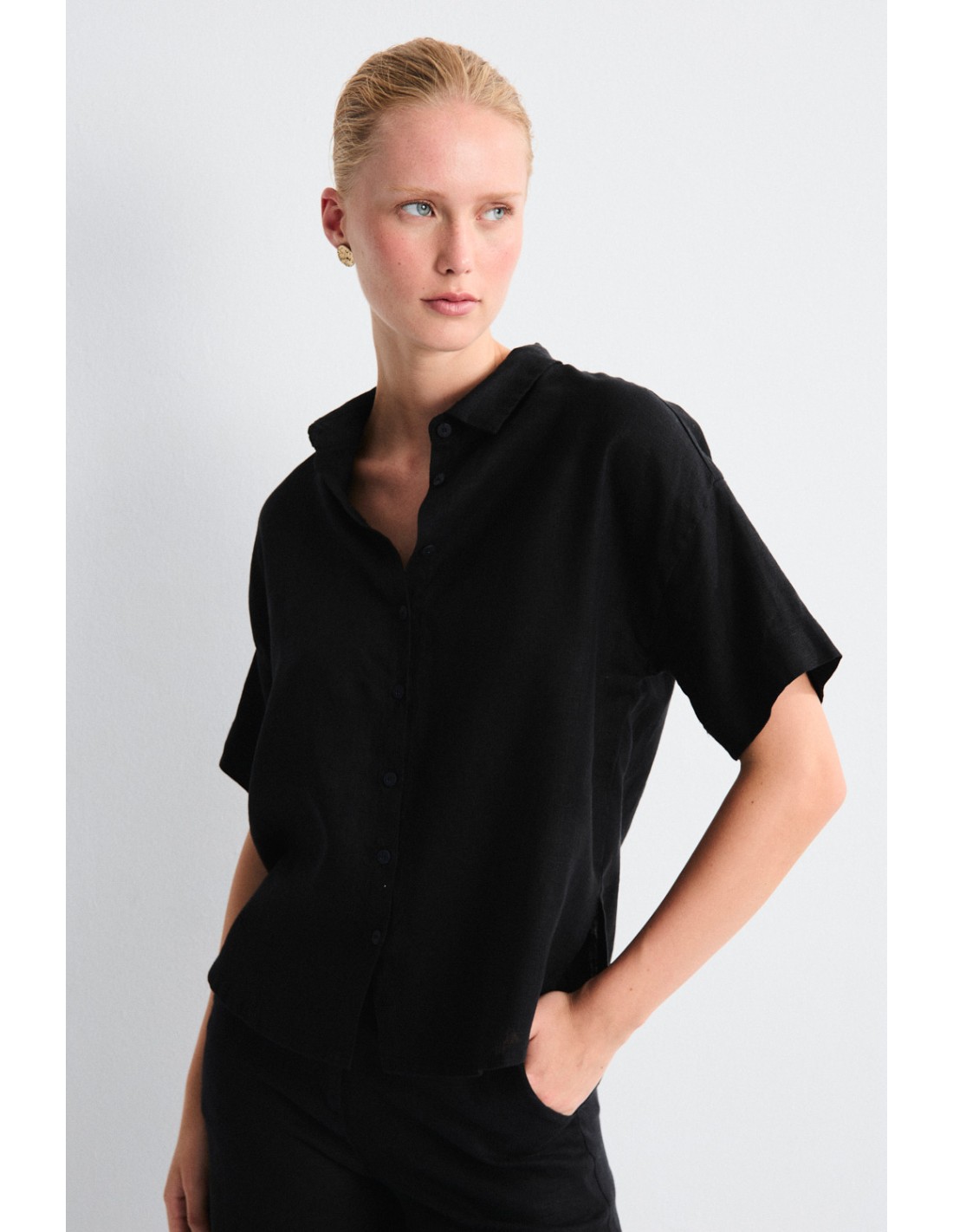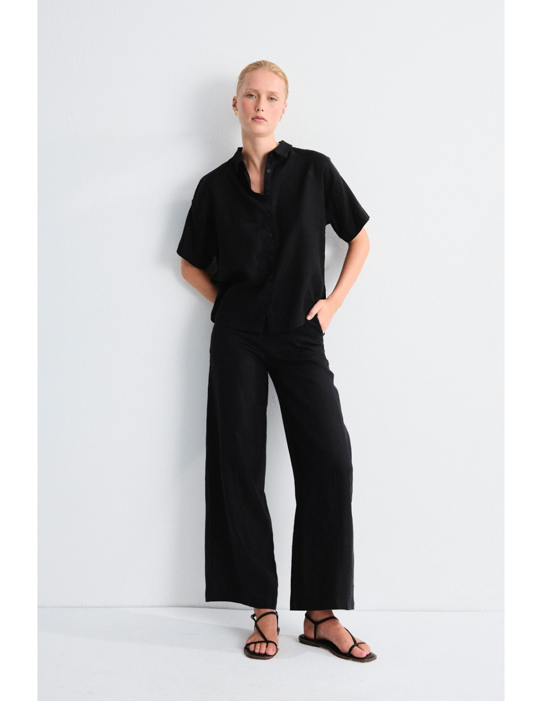 Camisa de lino con cuello camisero, manga corta y cierre frontal con botones, de silueta relajada y esencia atemporal. Consigue tu total look combinándola con los pantalones Bobby.
