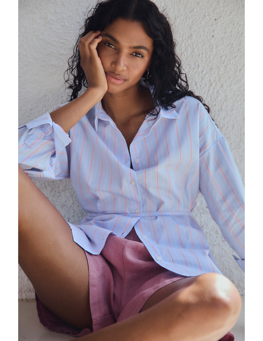Camisa oversize de rayas con bajos redondeados, manga larga y detalle de tira en la espalda con trabillas, que permite ajustar la cintura o llevarla a modo de cinturón. Combínala con los shorts Icaro para un total look con un toque moderno.