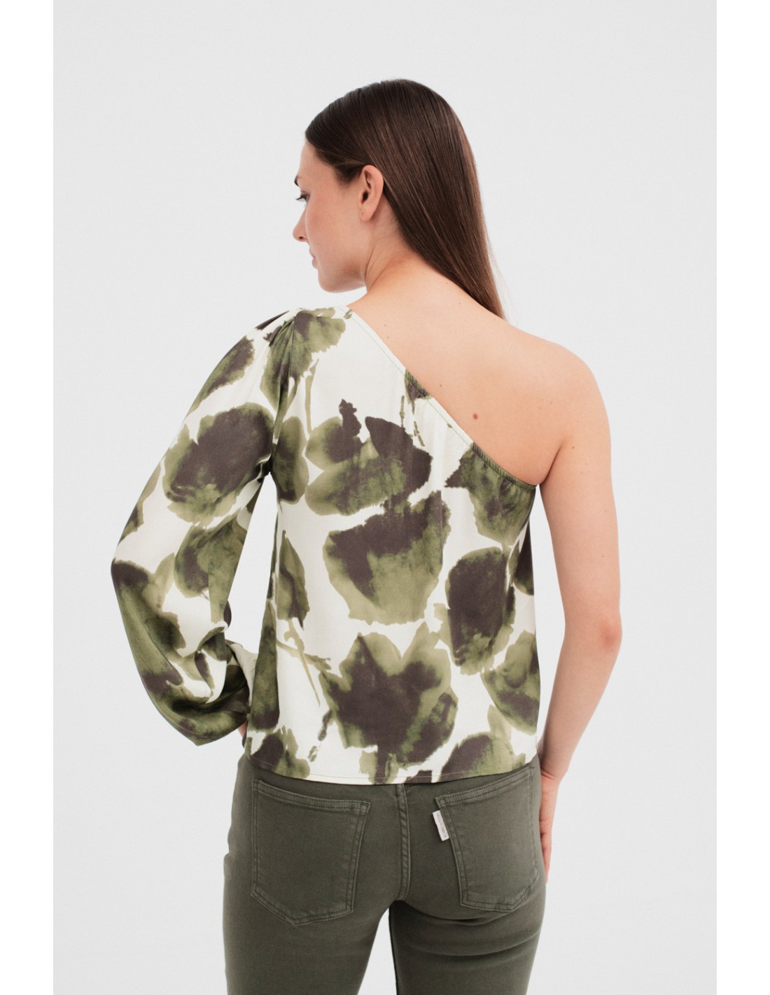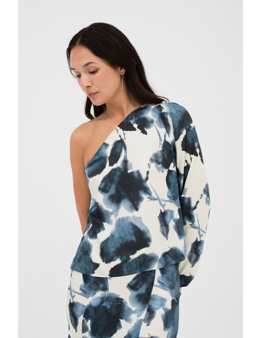 Blusa estampada de diseño único con una sola manga con volumen y goma en el puño. Las aberturas laterales añaden movimiento a la prenda. Combina con la falda Perier, creando un look sofisticado.