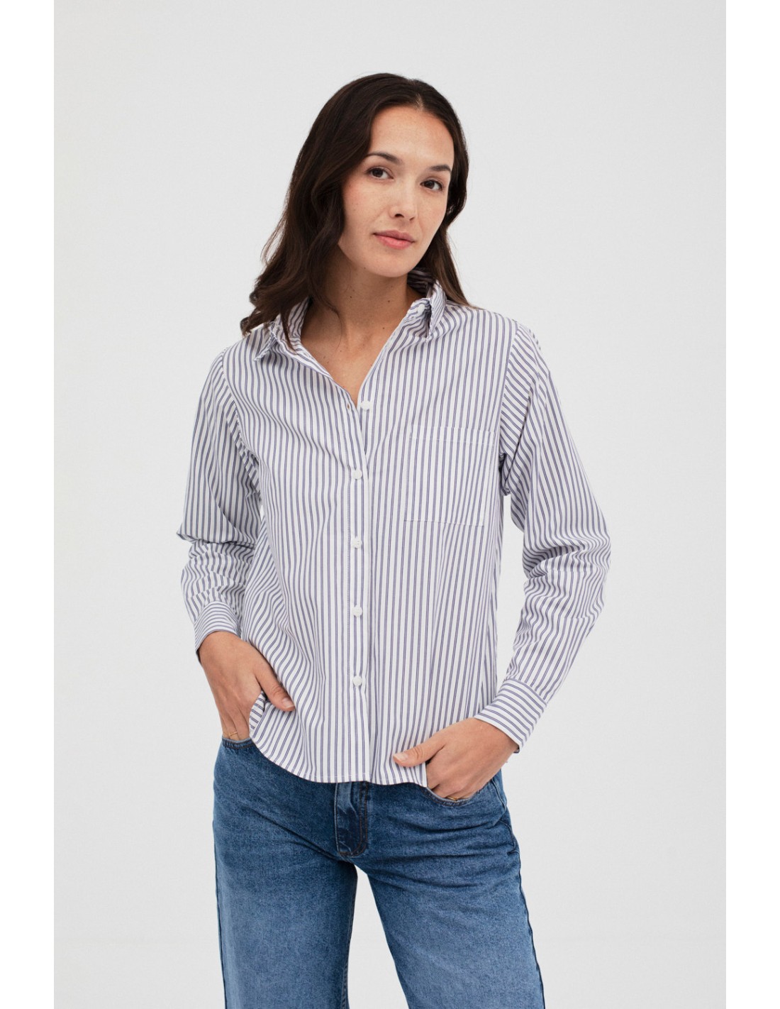 Una camisa de rayas de algodón con cuello camisero con canesú y bolsillo en el pecho. Tiene aberturas laterales y puño doble con botón. Perfecta para la oficina.