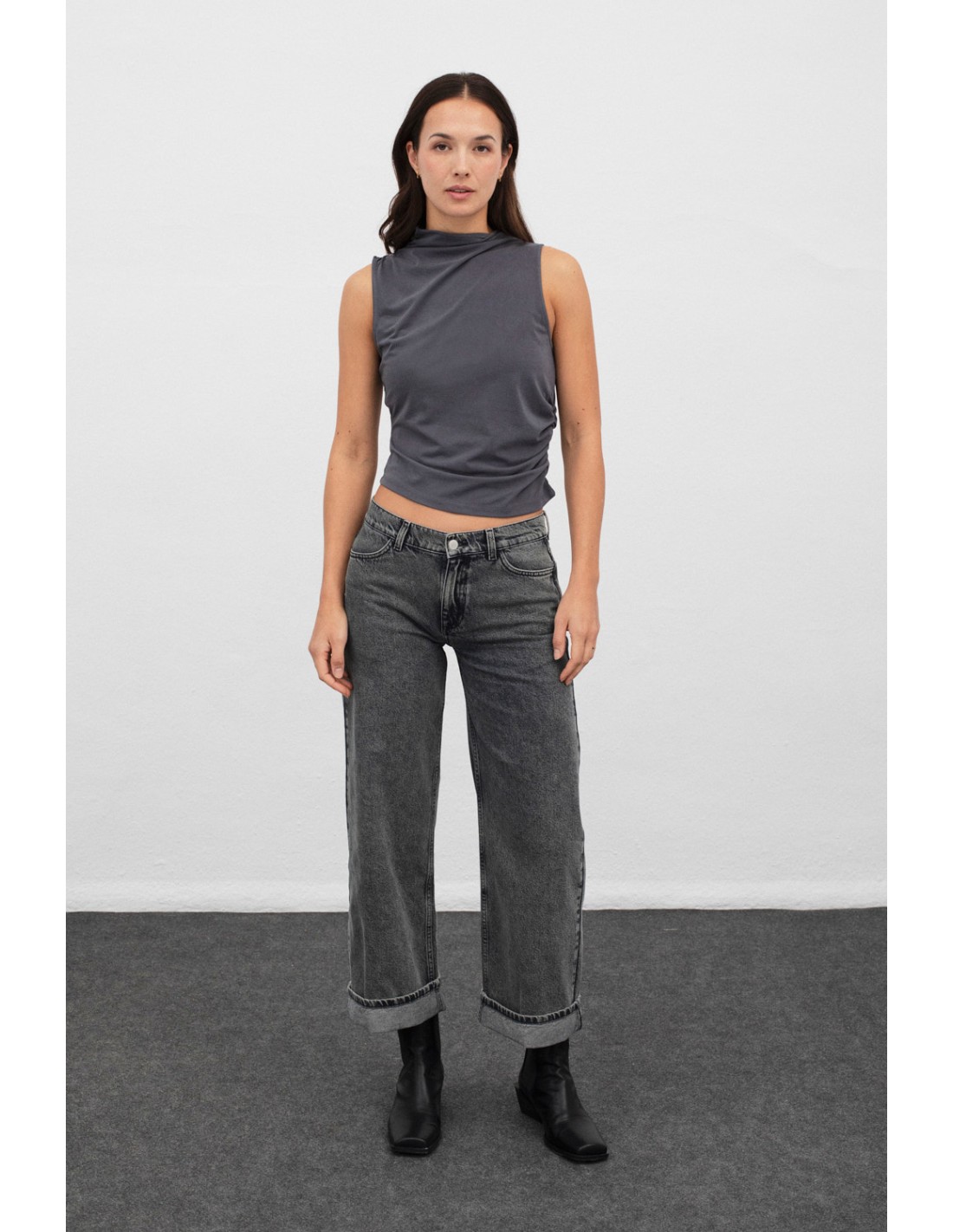 Top con efecto cupro, que destaca por su escote diagonal y los fruncidos en el hombro y la cintura. Ideal para un look elegante, combina con la falda Spital.