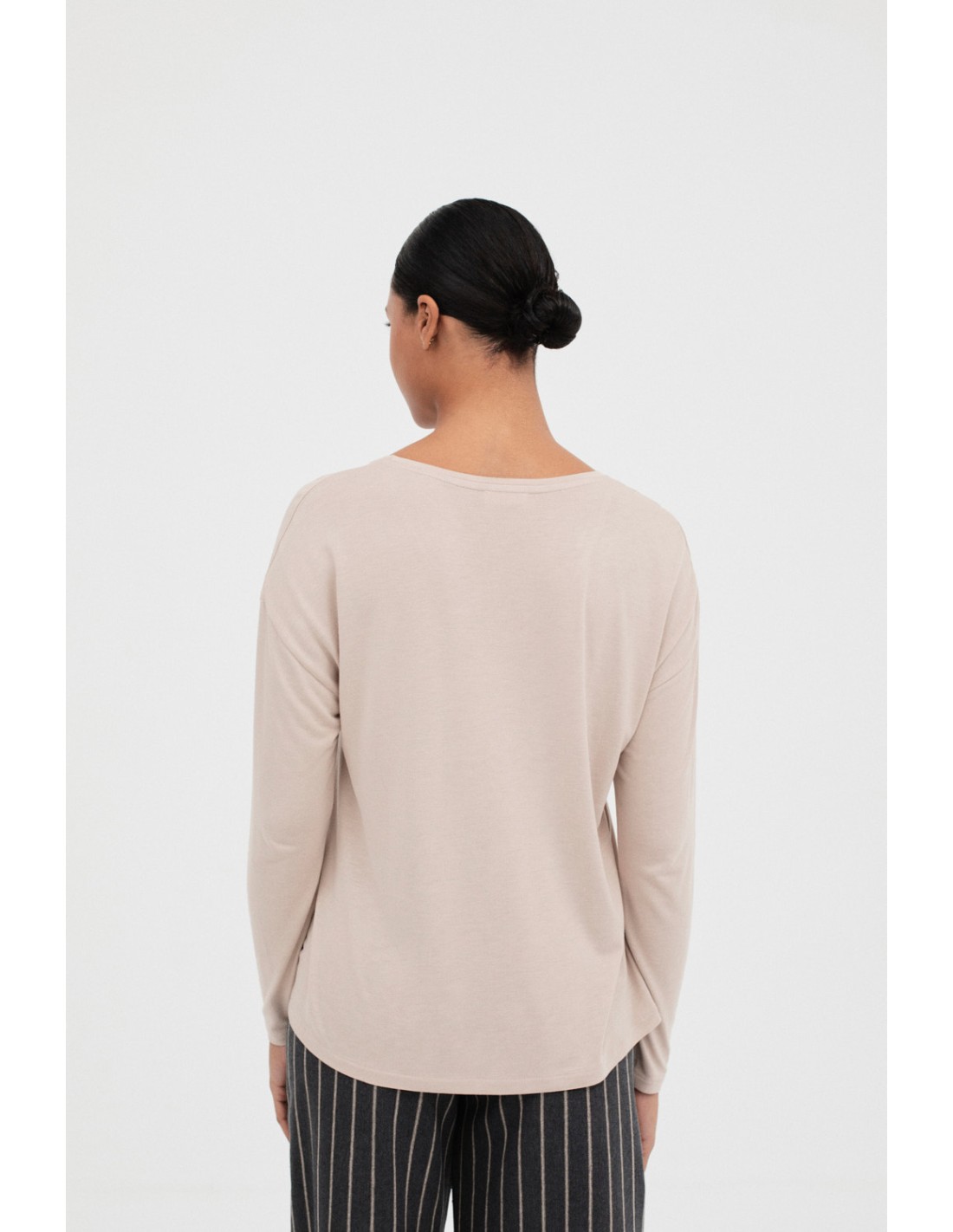 Esta camiseta bimateria combina estilo y textura con su diseño de manga larga y escote en pico. De tejido suave, es cómoda y perfecta para un look casual con un toque especial.