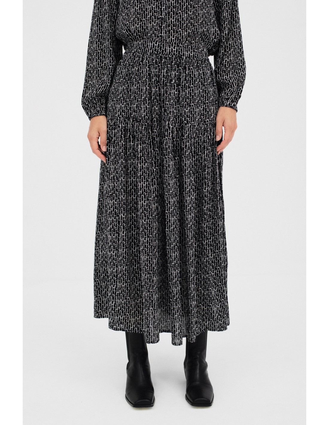 Arrayan es una falda estampada de vuelo con doble capa y prácticos bolsillos laterales. Combínala con la blusa Annex para un total look único.
