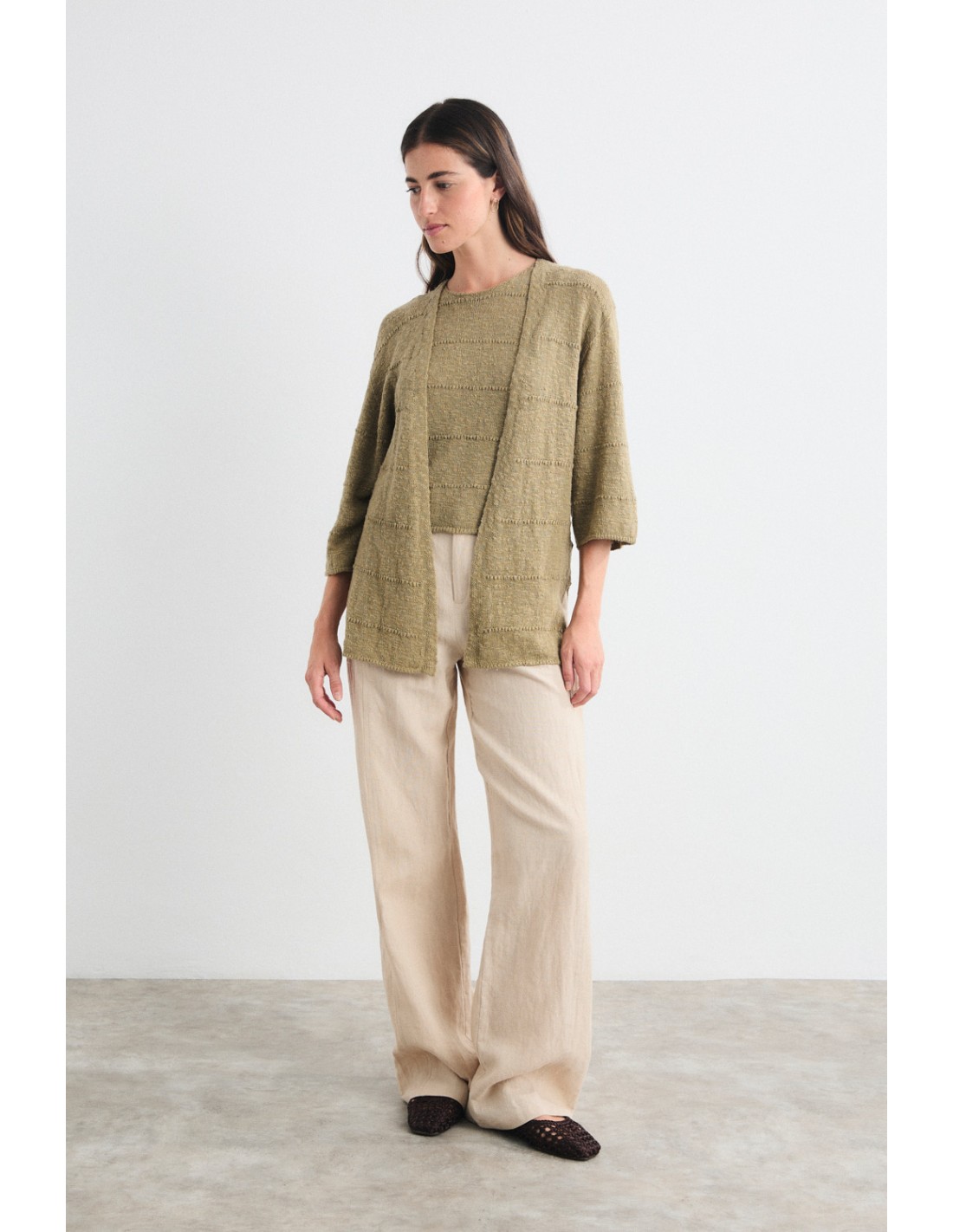 Kimono de punto fantasía con manga tres cuartos, que destaca por su textura y suavidad. Forma parte de la familia Nunavut, junto al jersey y la camiseta del mismo hilo.