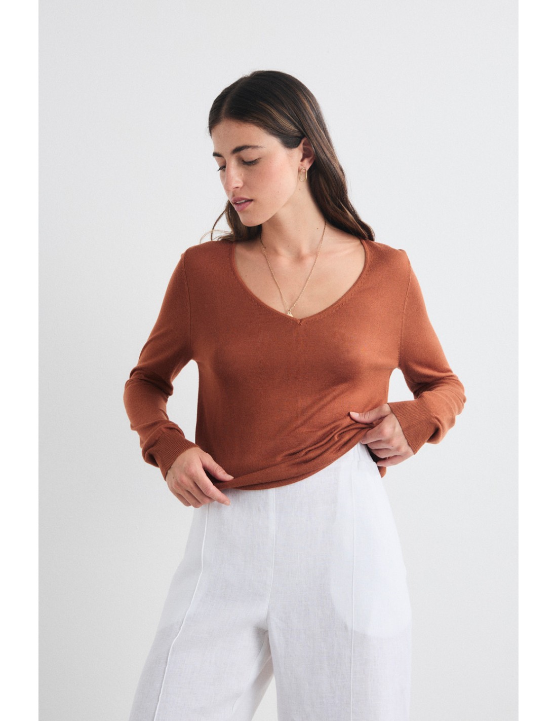 Jersey básico de escote en pico con acabados de canalé, pensado para acompañar con su suavidad cualquier look de temporada. Pertenece a la familia Yakira, junto al cárdigan y el top del mismo hilo.