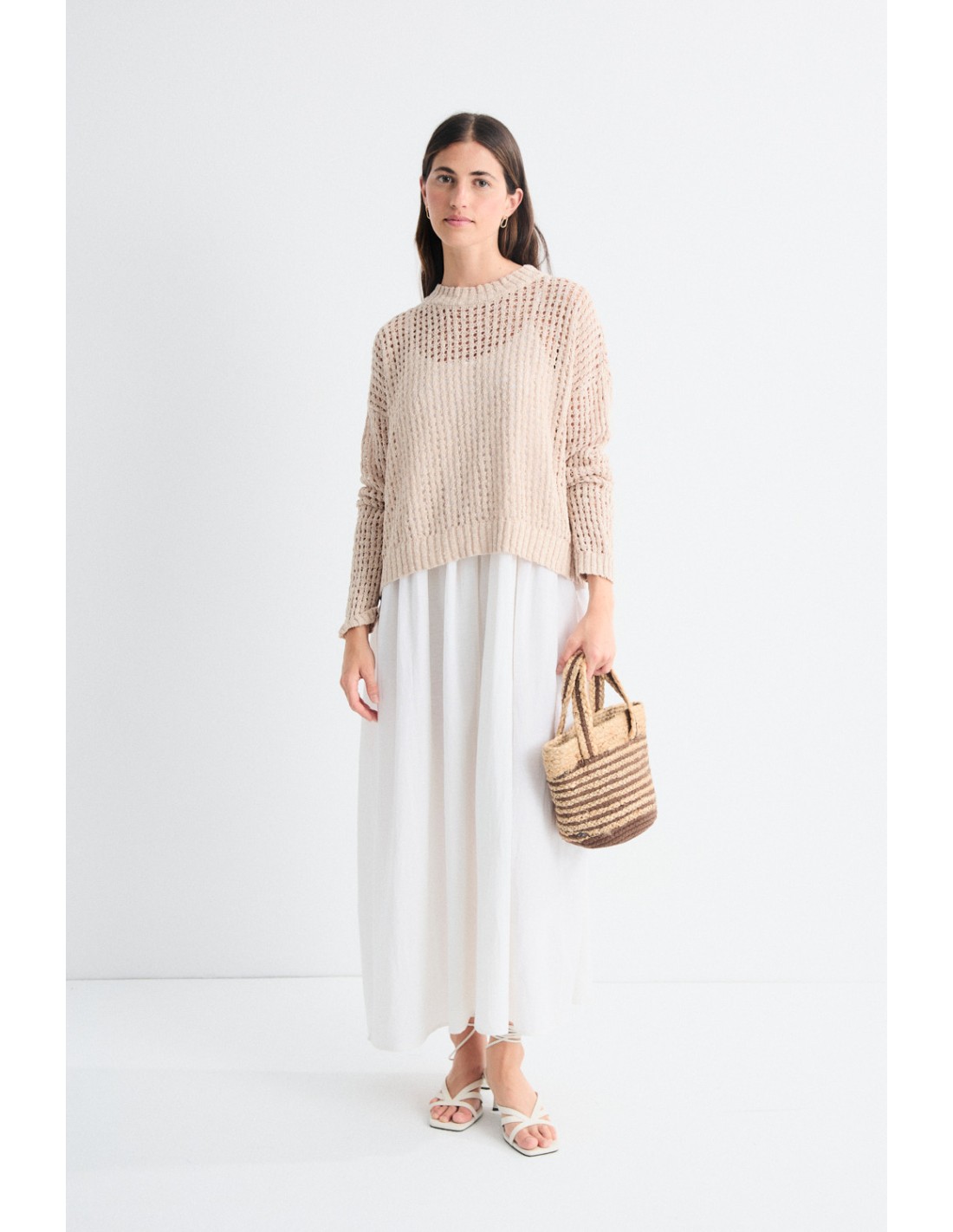 Jersey de punto fantasía, cuello redondo de canalé y mangas largas rematadas en puño también acanalado. Pertenece a la familia Balam, junto al jersey de manga corta y el top del mismo hilo.