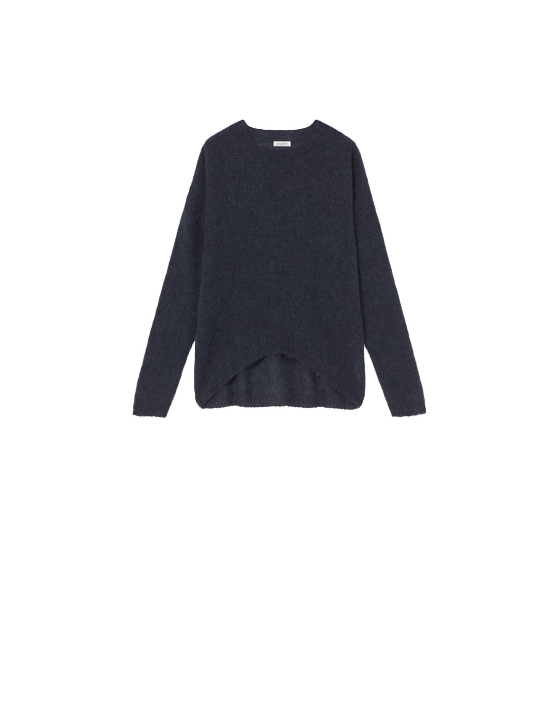 Un jersey de punto liso con cuello redondo y manga larga. Es de tricot integral y presenta acabados en canalé, bajo redondeado y un diseño ligeramente más corto en el delantero.