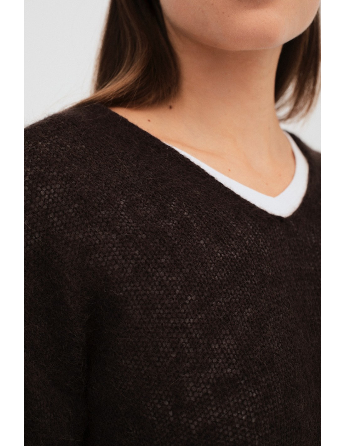 Trevi es un jersey de punto liso con cuello pico, manga larga y bajos redondeados. Es de tricot integral y perfecto para un look cómodo y moderno.