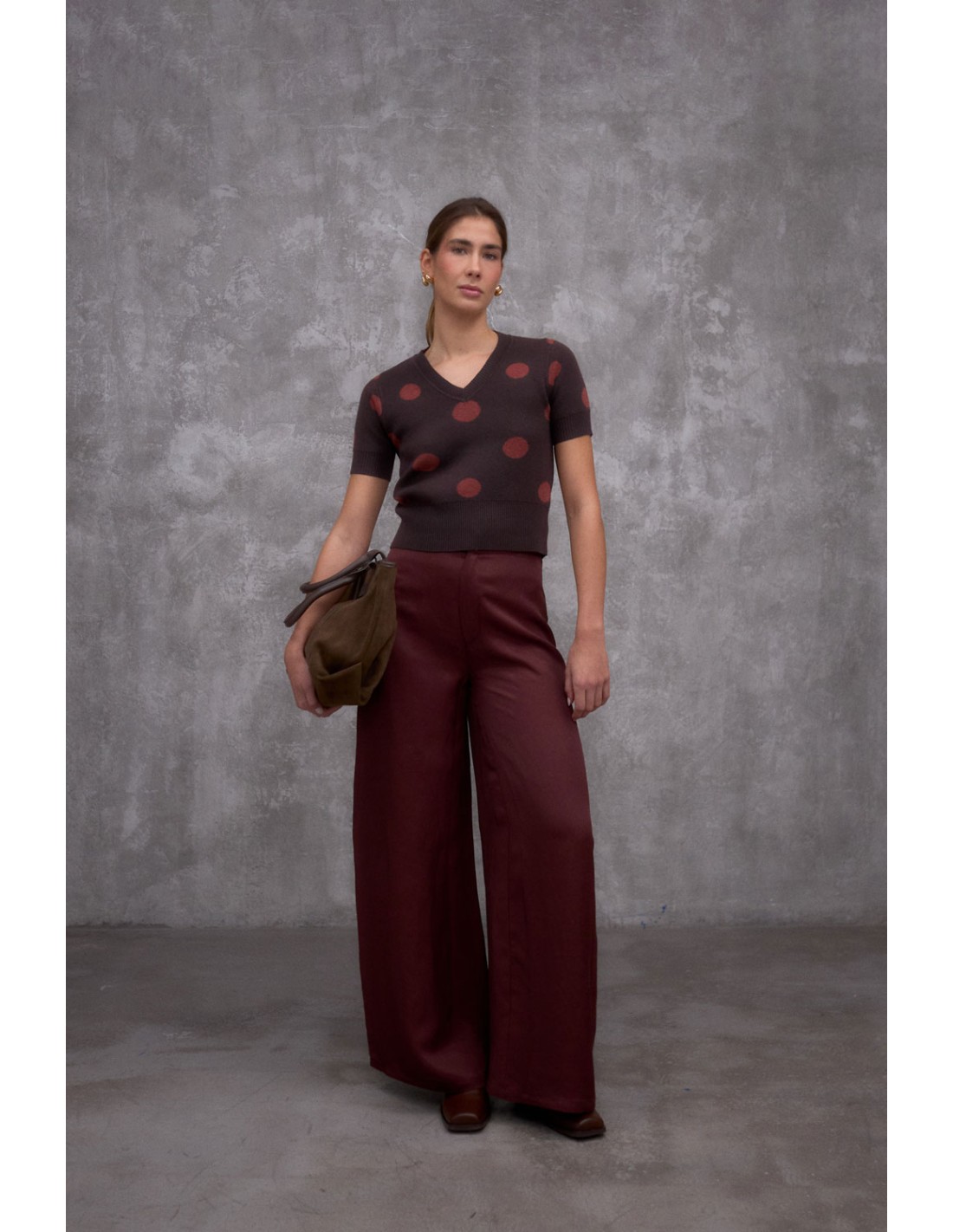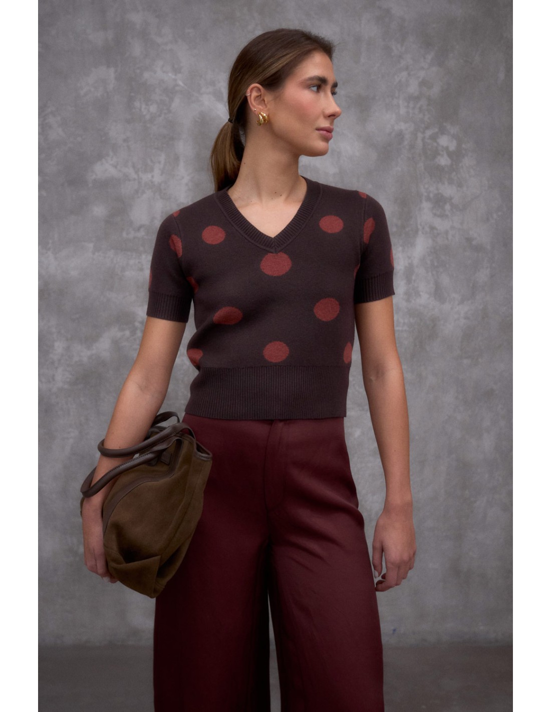 Jersey de manga corta con escote en V de canalé, decorado con jacquard de lunares en cuerpo y mangas. Presenta acabados de canalé en puños y bajo que aportan un toque estructurado y cuidado.