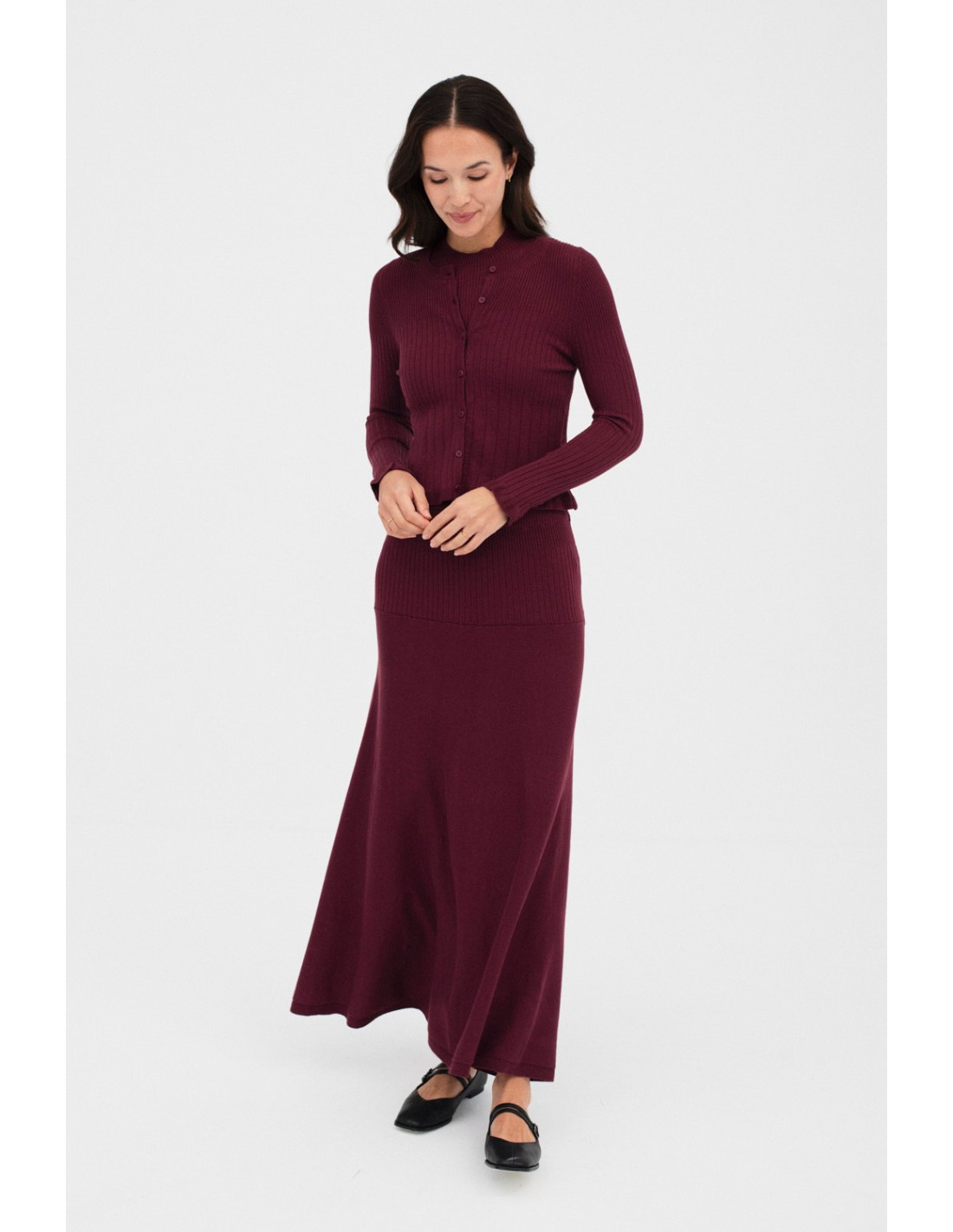 Cárdigan de manga larga y corte recto, con un diseño único que combina tres tipos diferentes de canalé en el cuerpo y dos en las mangas. Tiene un cuello redondo y una abertura con botones en frente. Los puños cuentan con un detalle de tres botones. Combina a la perfección con el top Seef, para un diseño dos piezas.