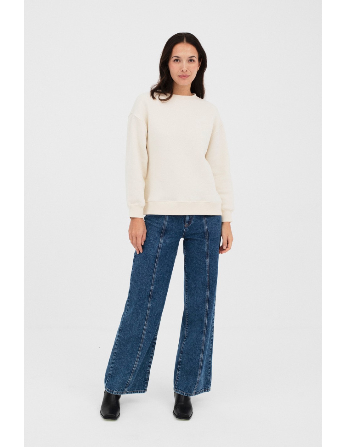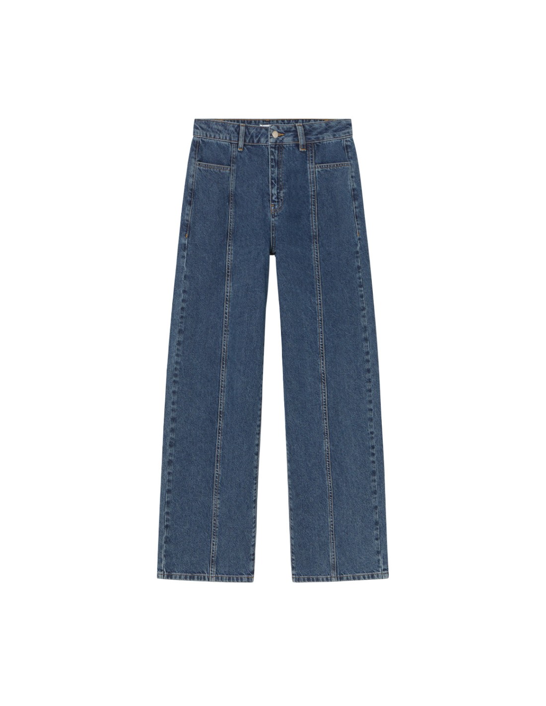 Pantalón tejano de tiro alto y corte ancho, con costuras centrales que aportan un ajuste elegante y moderno.