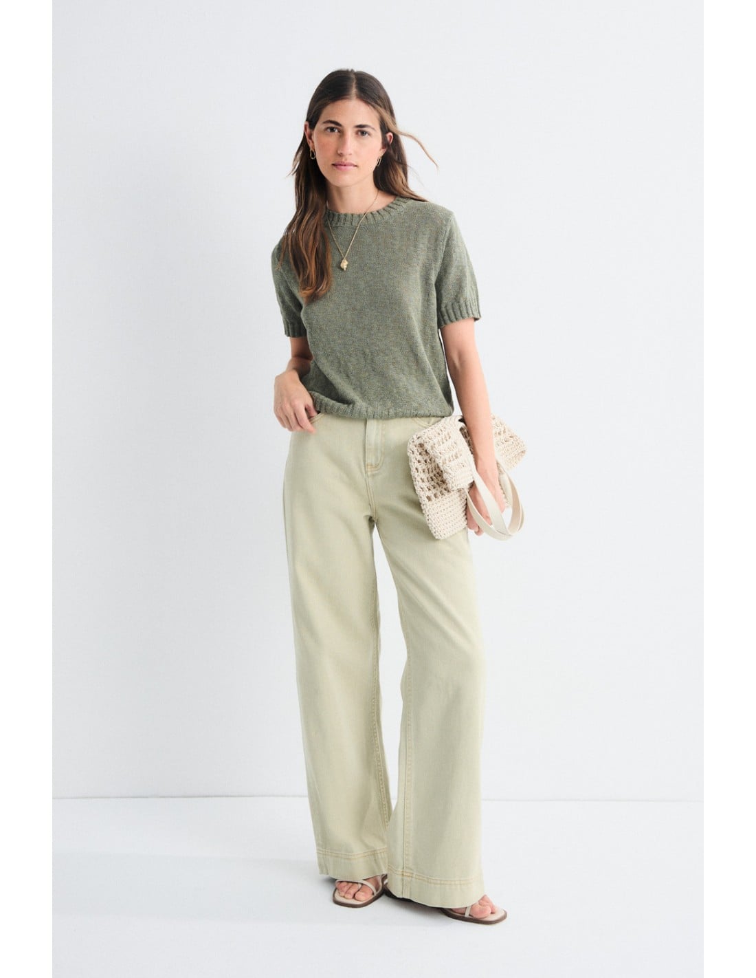 Pantalón largo de sarga con botón metálico y corte recto. Disponible en una paleta de colores pastel, ideal para dar la bienvenida a la primavera.
