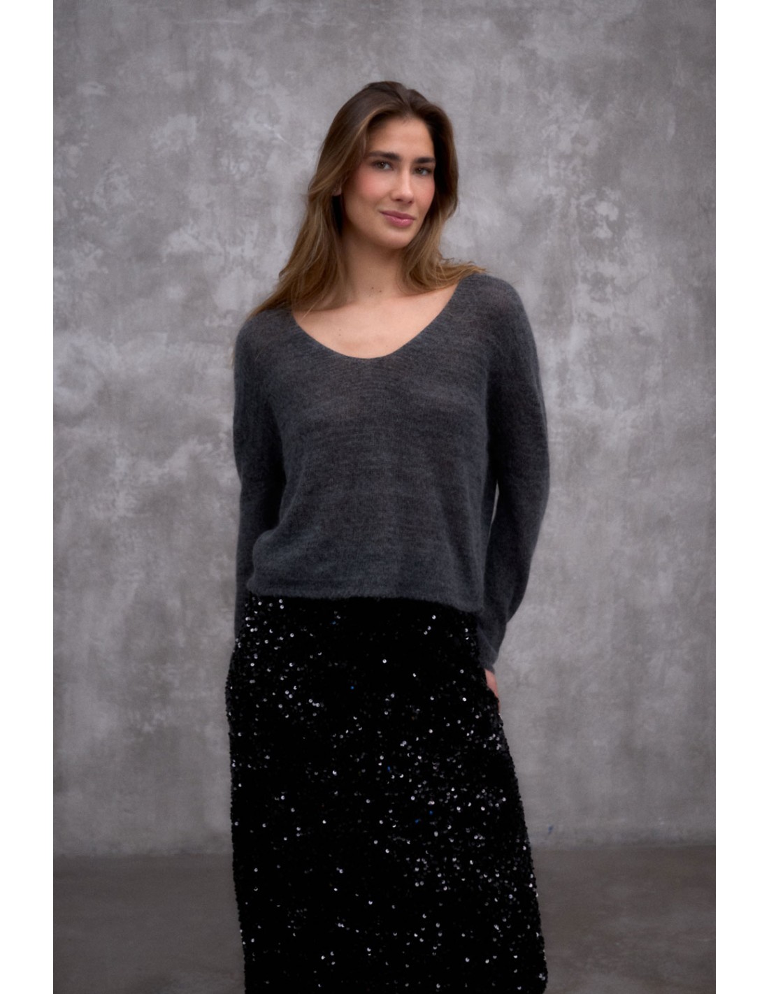 Jersey de punto metalizado con cuello redondo de canalé y manga larga. Presenta un detalle de nervio con calados en la espalda. Combínalo con la capa Trine para un look elegante estas fiestas.