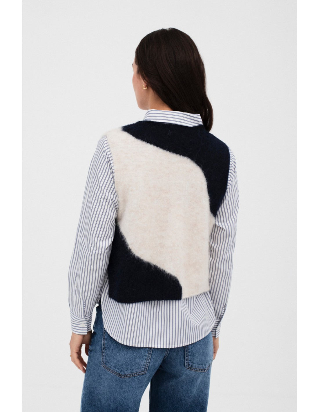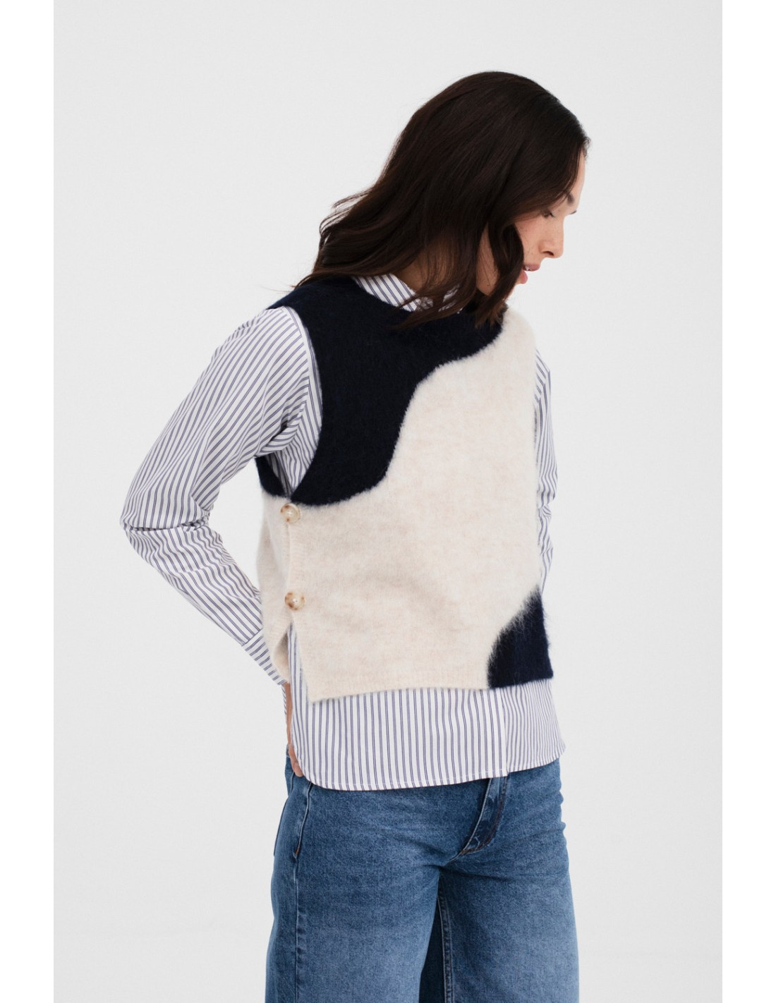 Chaleco de cuello redondo con intarsia bicolor. Detalle de aberturas laterales con botones a tono, que crean un diseño moderno y único para tu look.