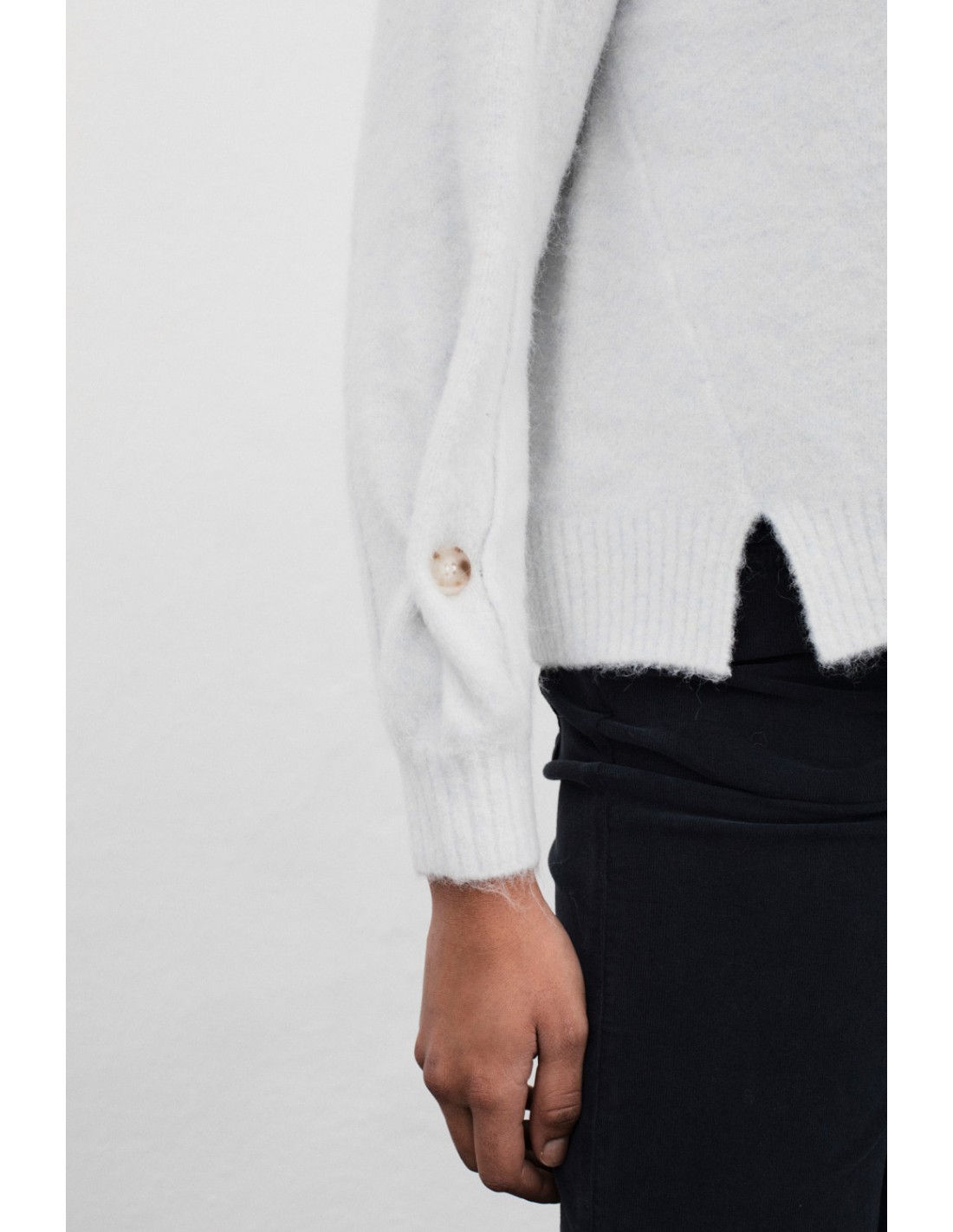 Jersey de manga larga y cuello alto con detalle de botonadura lateral en cuello y hombro. Los puños tienen botones que permiten crear un elegante pliegue, añadiendo un toque único y sofisticado.