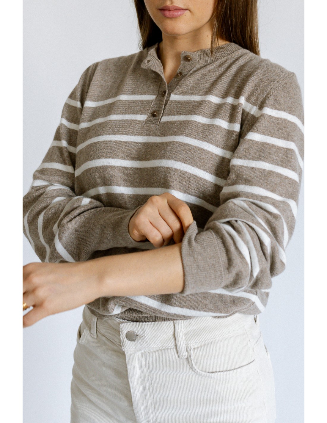 Jersey de manga larga con cuello redondo y tapeta de canalé con botones; puños y bajo con canalé 2x1. Cuerpo con punto simple y rayas a contraste; mangas montadas.