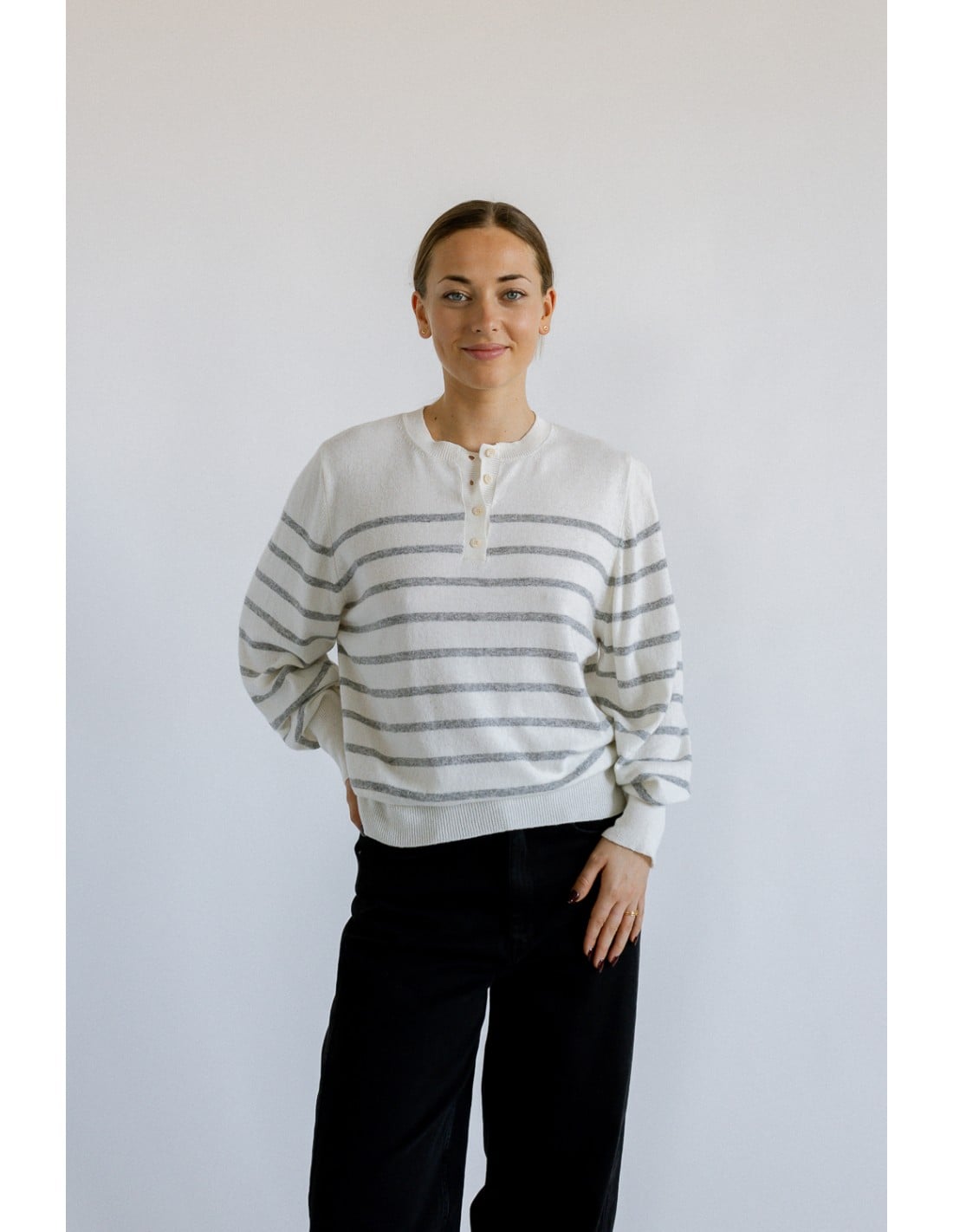 Jersey de manga larga con cuello redondo y tapeta de canalé con botones; puños y bajo con canalé 2x1. Cuerpo con punto simple y rayas a contraste; mangas montadas.