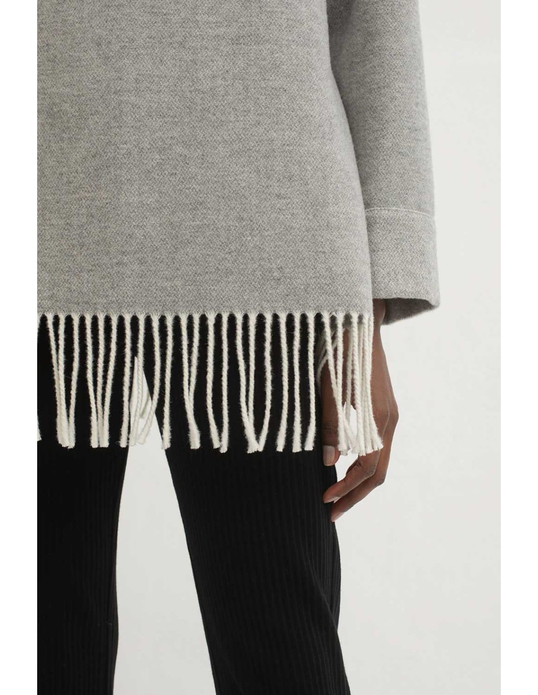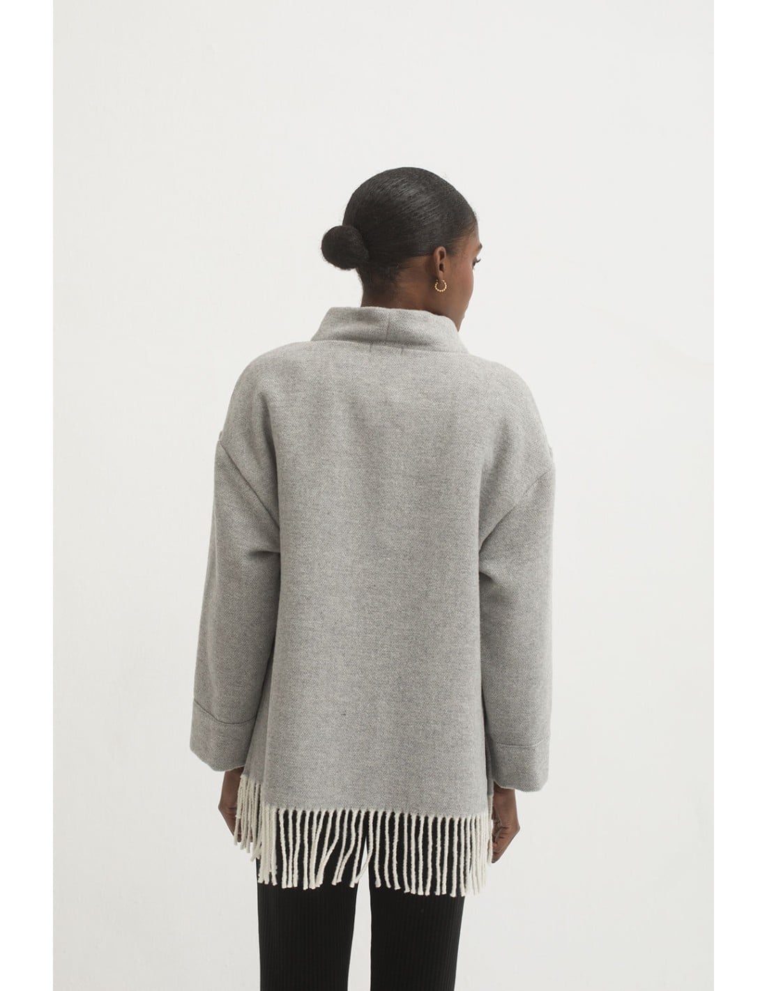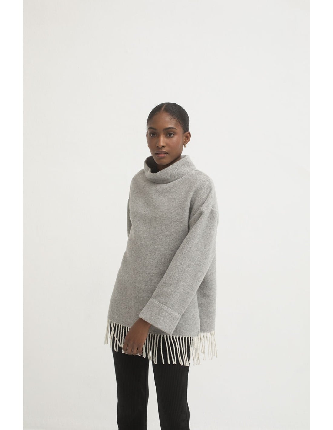 El jersey Caima es un jersey de cuello chimenea que cuenta con grandes aberturas laterales y detalles de flecos en el bajo, ofreciendo un diseño distintivo y moderno. Si te gustan los flecos no te pierdas el abrigo Cluta y la bufanda Cable.