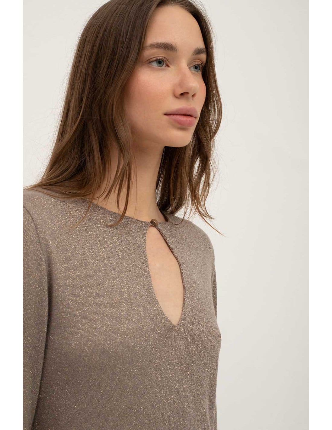 El vestido Tietar es una prenda tricot de lurex de longitud larga, que presenta una abertura lateral y un escote con detalle en forma de lágrima.