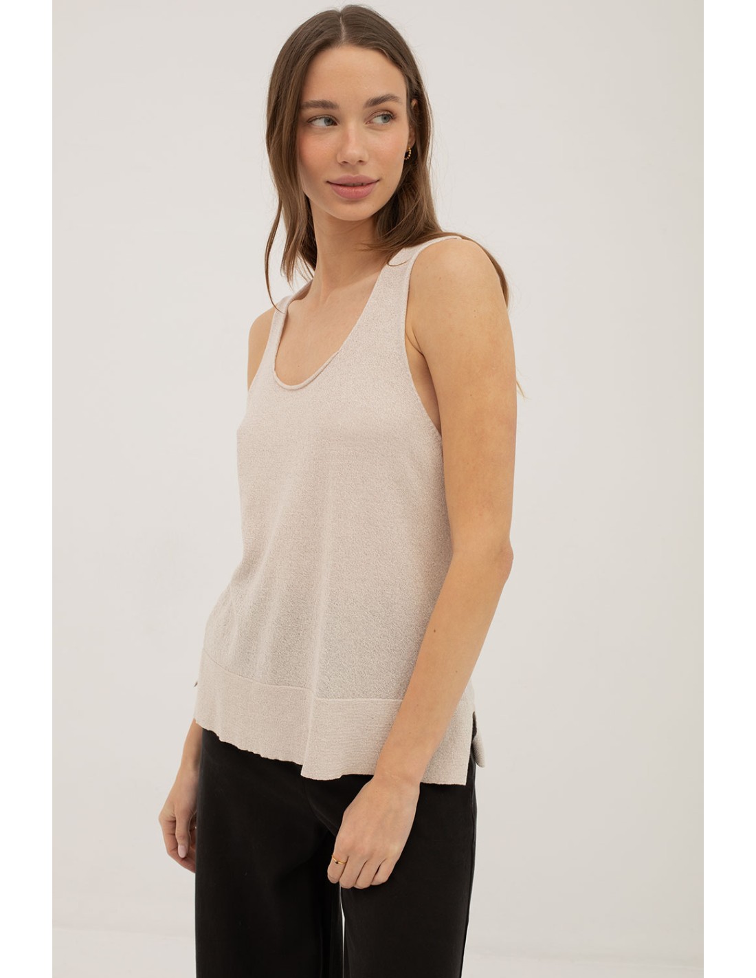 El top Torto es una prenda de punto metalizado con escote redondo, ofreciendo un estilo moderno y elegante. Puedes crear un twin set si lo combinas con Touro. Si te gusta este hilo metalizado no te pierdas el Trancao y Tietar!
