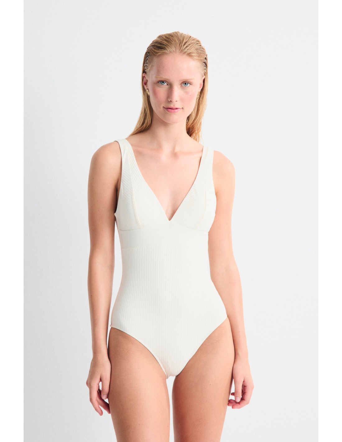 Bañador con tejido de canalé, escote pico y tirantes anchos. Espalda descubierta en forma de pico, dándole un toque sofisticado a tu bañador. Incluye aberturas con foam extraíble.La modelo lleva la talla S.