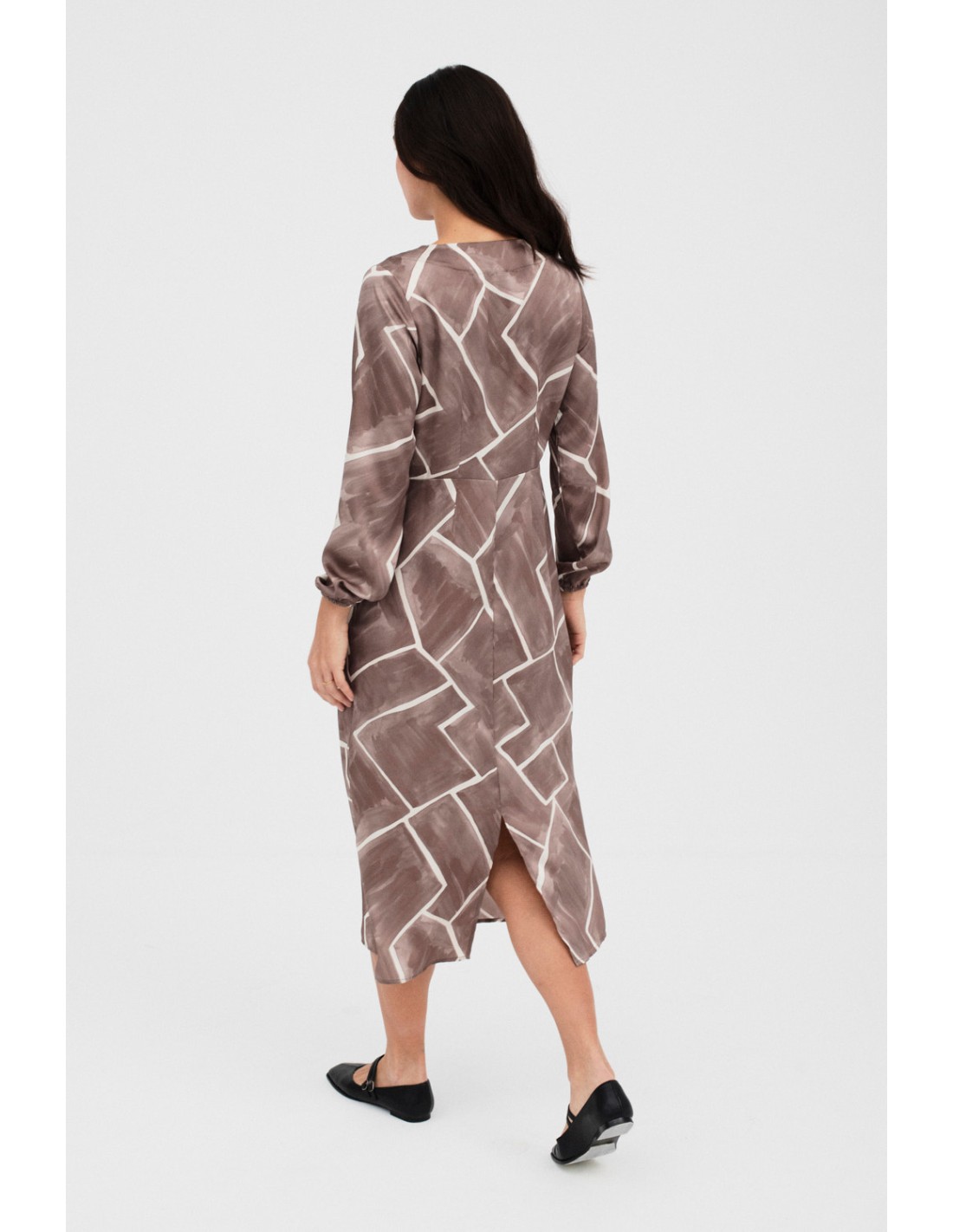 Vestido estampado largo de manga larga, con lágrima en el escote y botón metálico de fantasía. Tiene un frunce en el talle y puños ligeramente abullonados, ideal para un look romántico.
