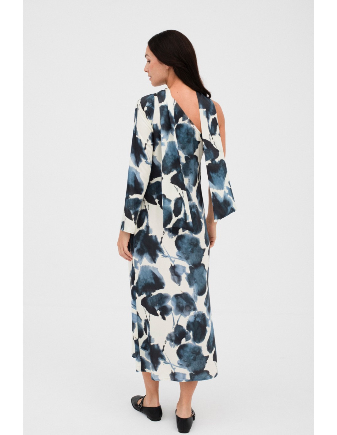 Vestido asimétrico con un estampado único. Diseñado con una manga y una abertura lateral. Incluye un pañuelo del mismo estampado con el que puedes hacer un chocker para darle un toque elegante. Cierre con cremallera invisible en lateral.