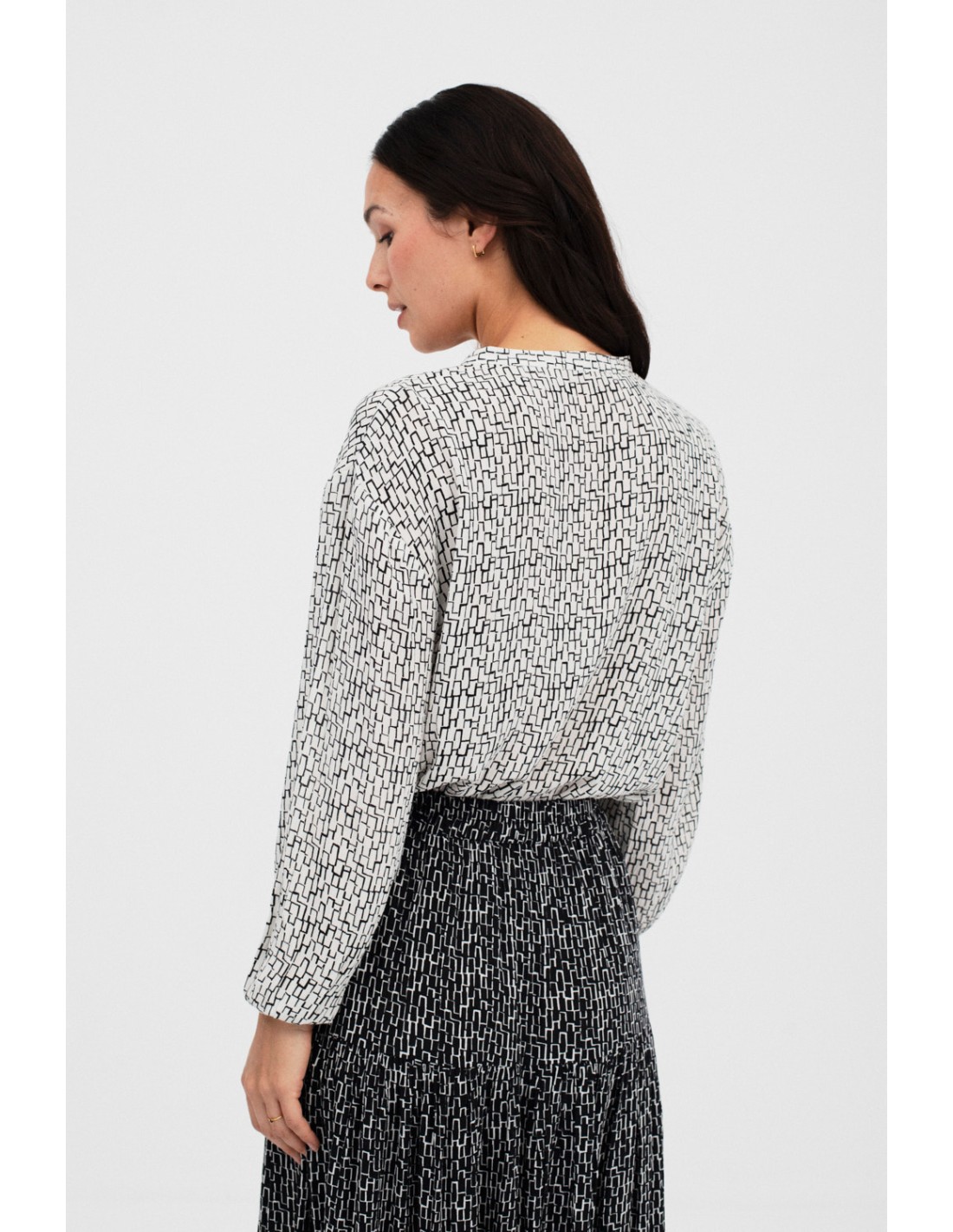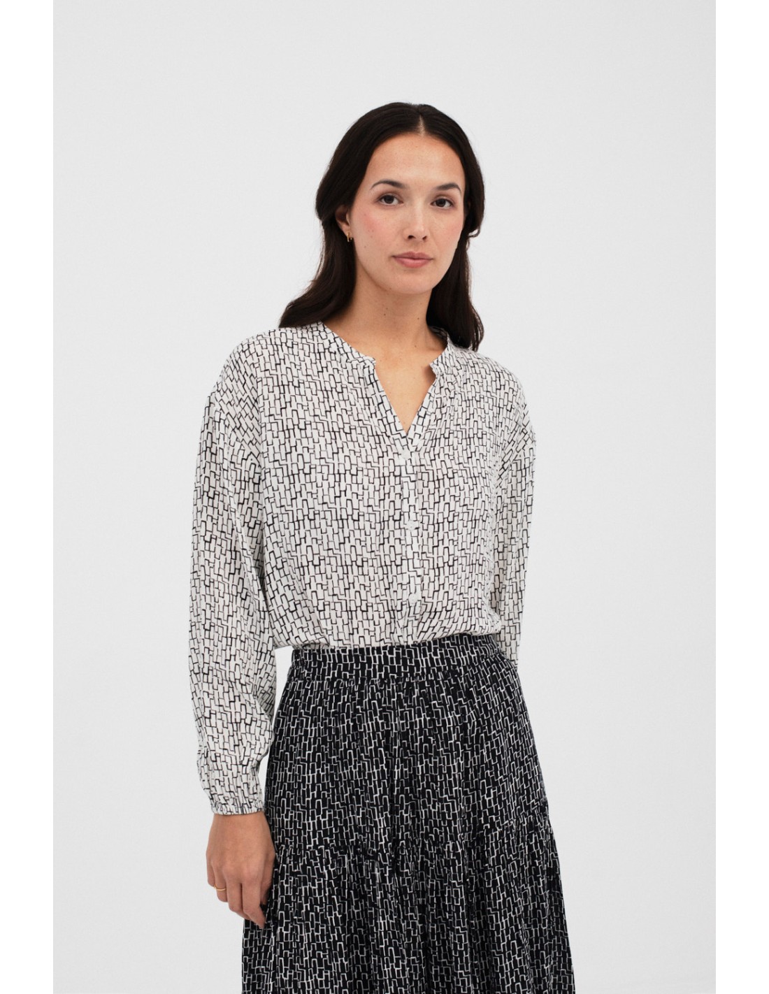 Annex est une chemise imprimée avec col mao, manches bouffantes et boutonnage frontal. Associez-la à la jupe Arrayan pour un look total.