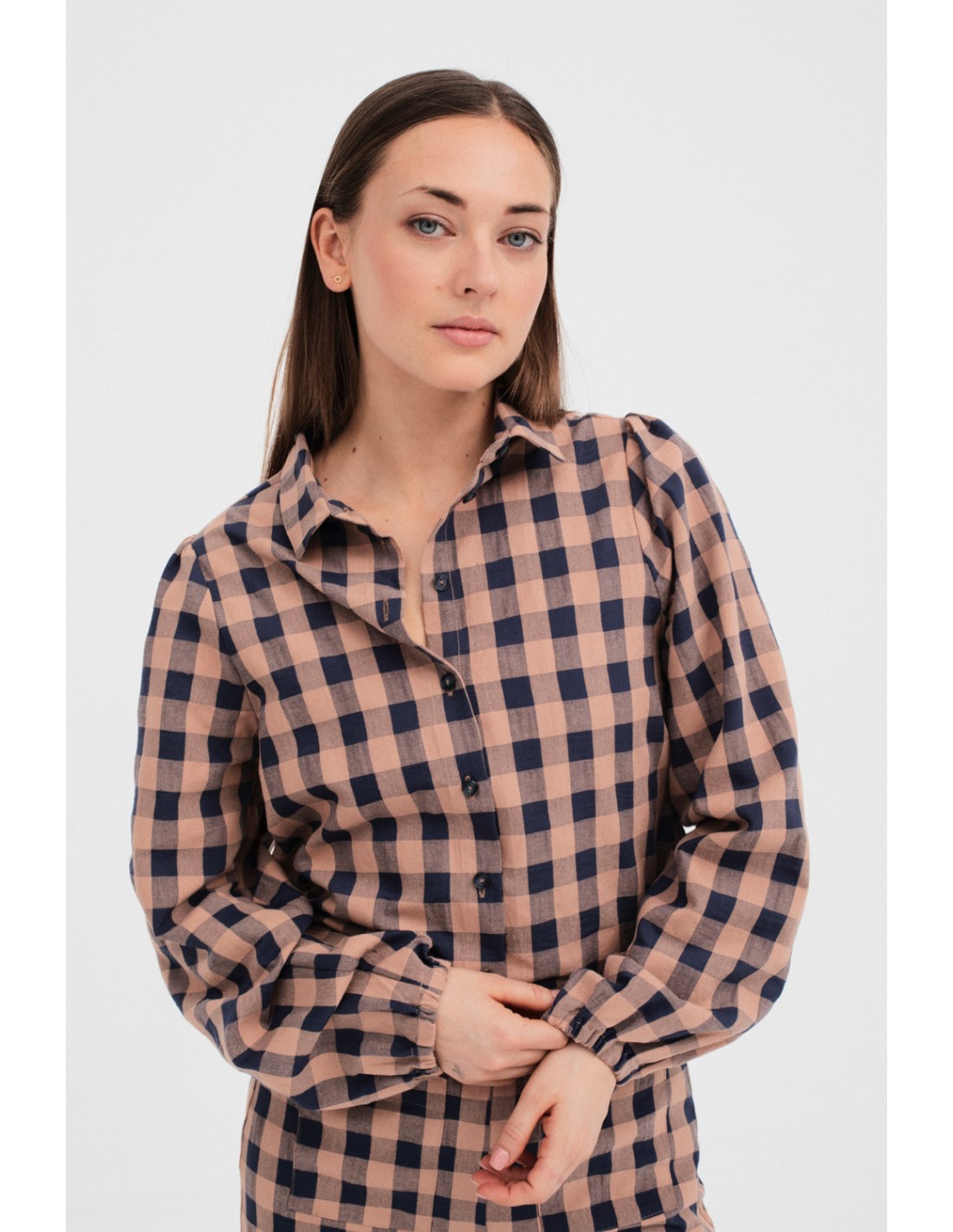 Chemise vichy avec col de chemise, boutons sur le devant et manches bouffantes avec élastique aux poignets. Associez-la à la jupe Marylebone ou au pantalon Malasaña pour un look complet.