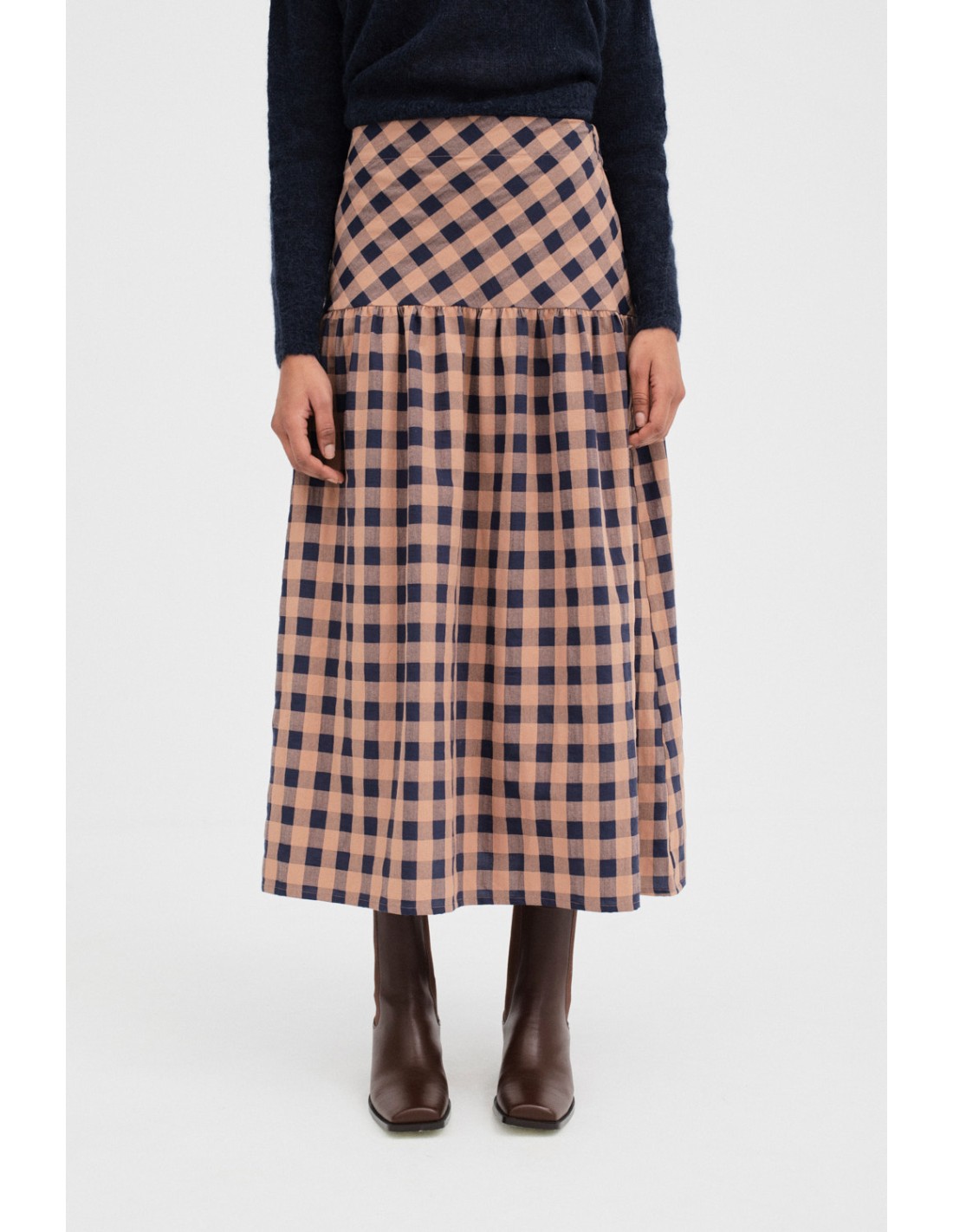 Jupe longue vichy avec canezou ajusté et ampleur à partir de la hanche, fermeture à fermeture éclair invisible sur le côté et élastique plat à l'arrière. Associez-la à la blouse Marlene et au sac Whitehall.