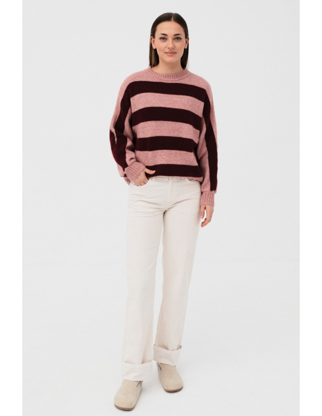 Pull basique à rayures avec manches japonaises et finitions en côte, lui donnant une touche unique et moderne.