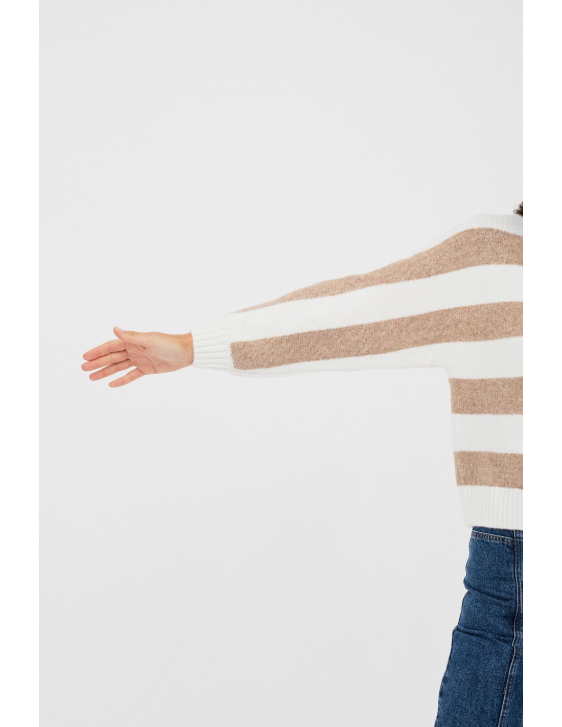 Pull basique à rayures avec manches japonaises et finitions en côte, lui donnant une touche unique et moderne.