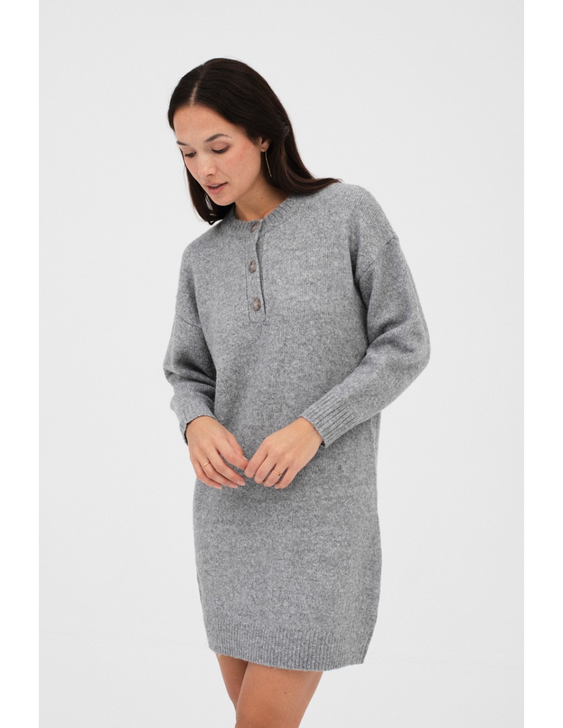 Robe courte en tricot avec finitions en côte et détail de patte de boutonnage sur le devant, lui donnant un style sophistiqué et polyvalent.