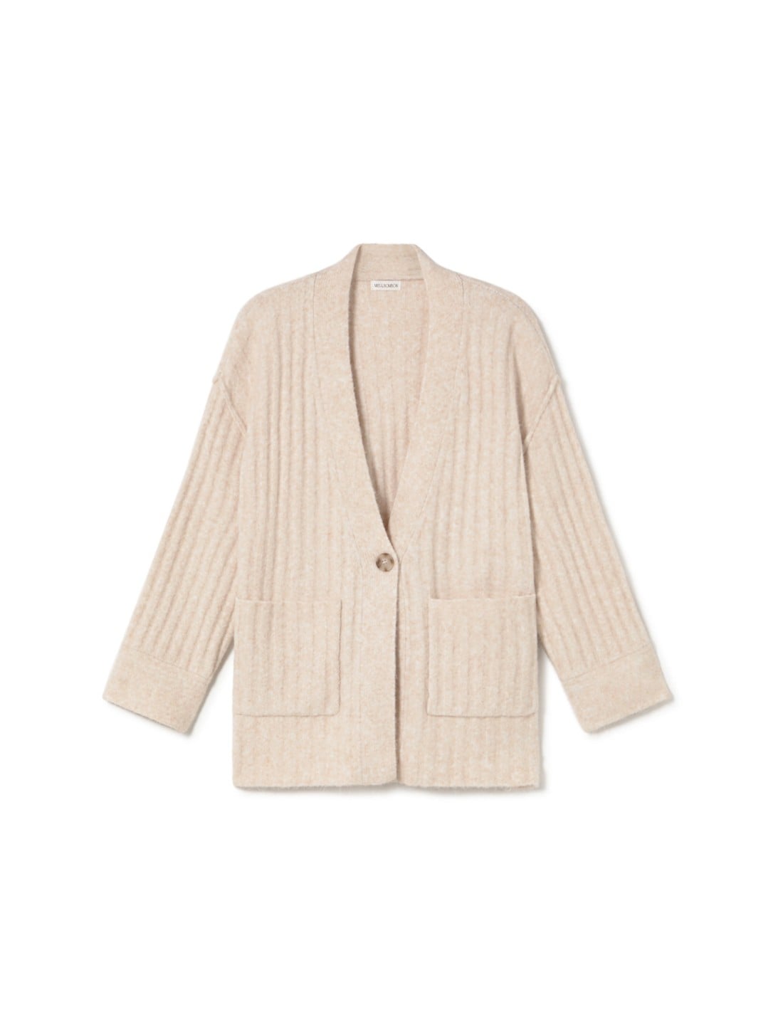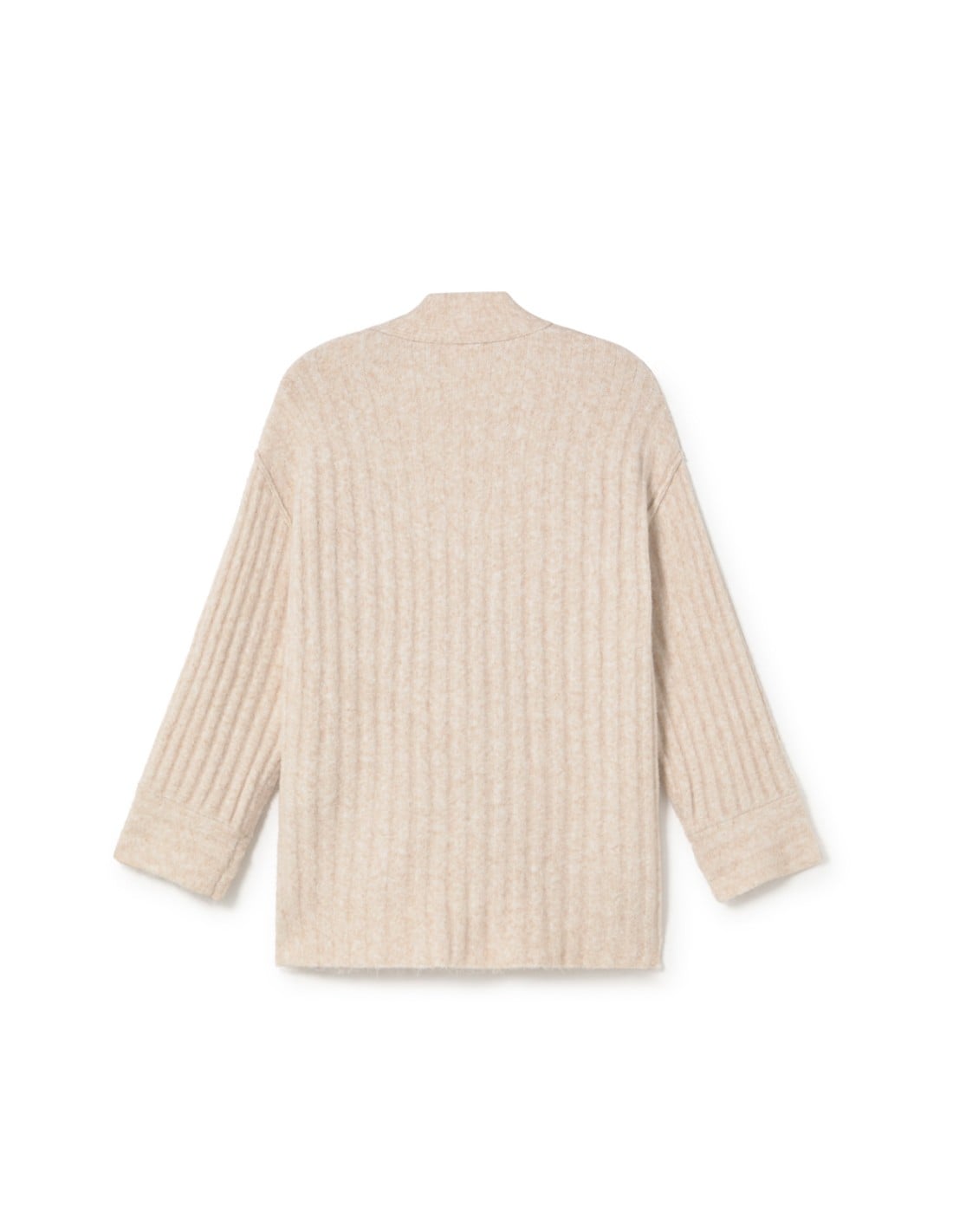 Cardigan en tricot côtelé avec des poignets en côtes horizontales repliés vers l'extérieur. Ouverture frontale avec boutons et fentes sur les côtés. Il dispose de deux poches avant. Se combine avec les accessoires Bukon et Busan.