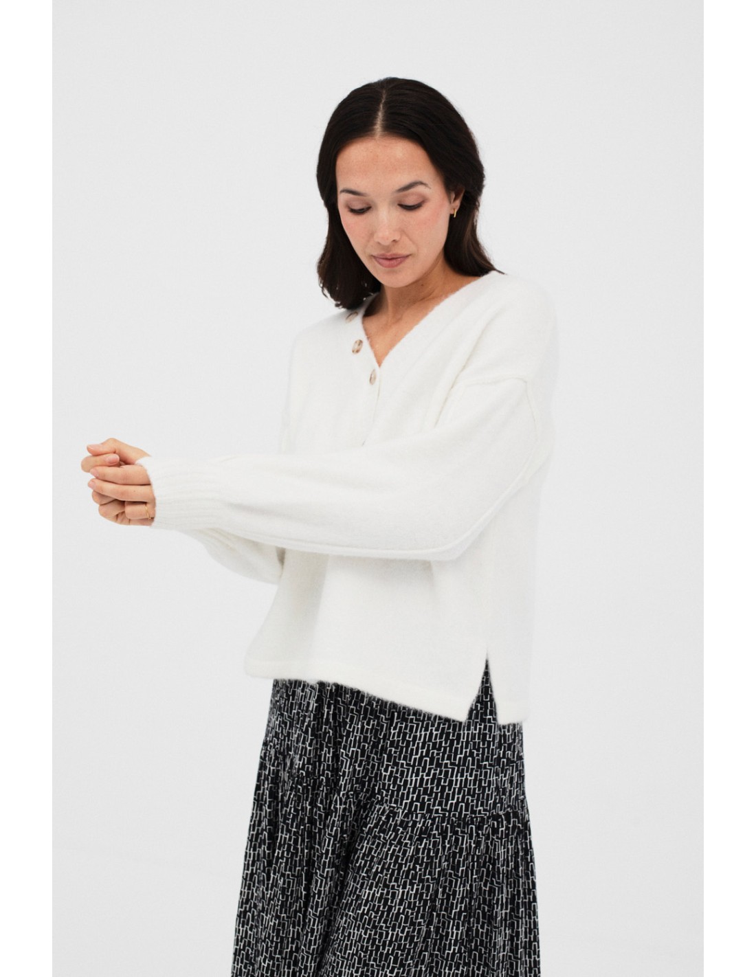 Pull à col en V avec une fausse ouverture à boutons et des poignets en côtes, lui donnant une touche unique et polyvalente.