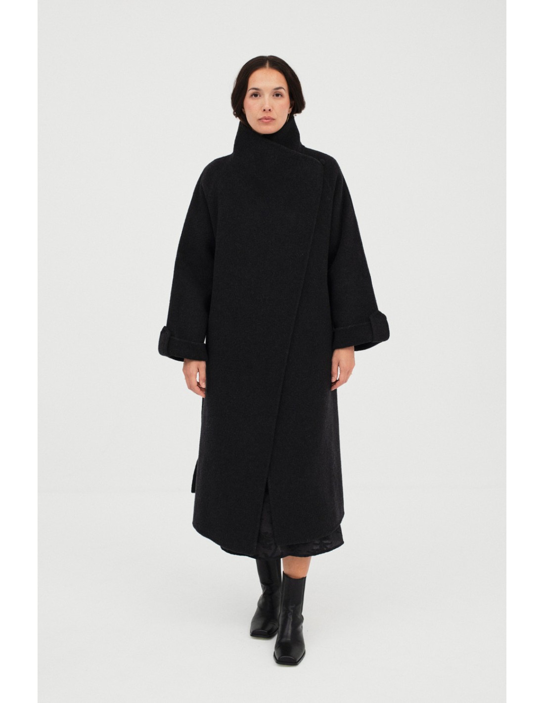 Elysses est un long manteau enveloppant, fermé par un bouton, doublé sur l'épaule et doté d'une ceinture. Il possède deux poches. Idéal pour un look élégant et confortable.