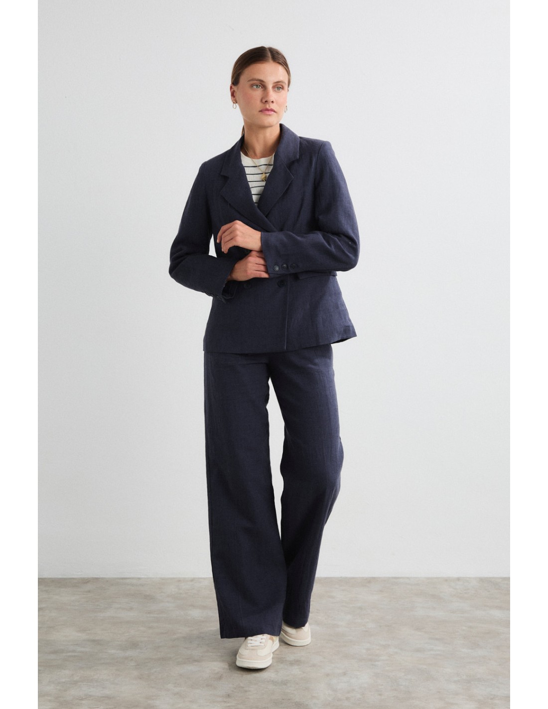 Pantalon droit et large, avec doubles coutures latérales et poches dans la couture. Fermeture zippée et boutonnée, avec ceinture élastiquée à l'arrière. Associé au blazer Akira pour un look sophistiqué par temps chaud.