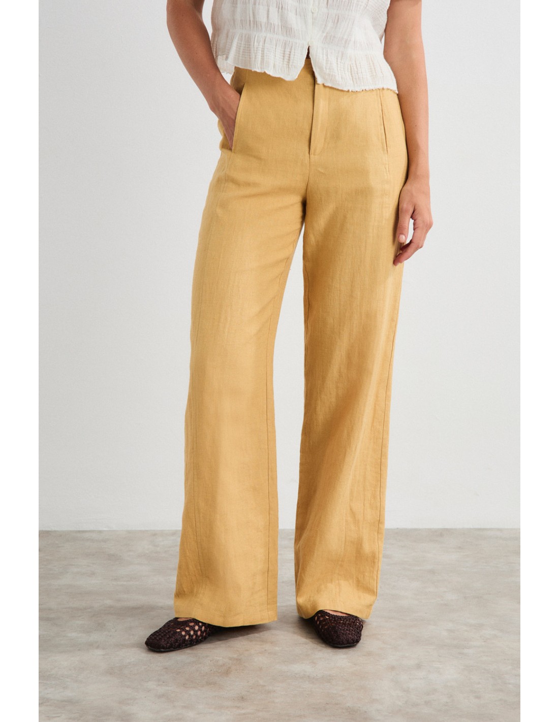 Pantalon droit et large, avec doubles coutures latérales et poches dans la couture. Fermeture zippée et boutonnée, avec ceinture élastiquée à l'arrière. Associé au blazer Akira pour un look sophistiqué par temps chaud.