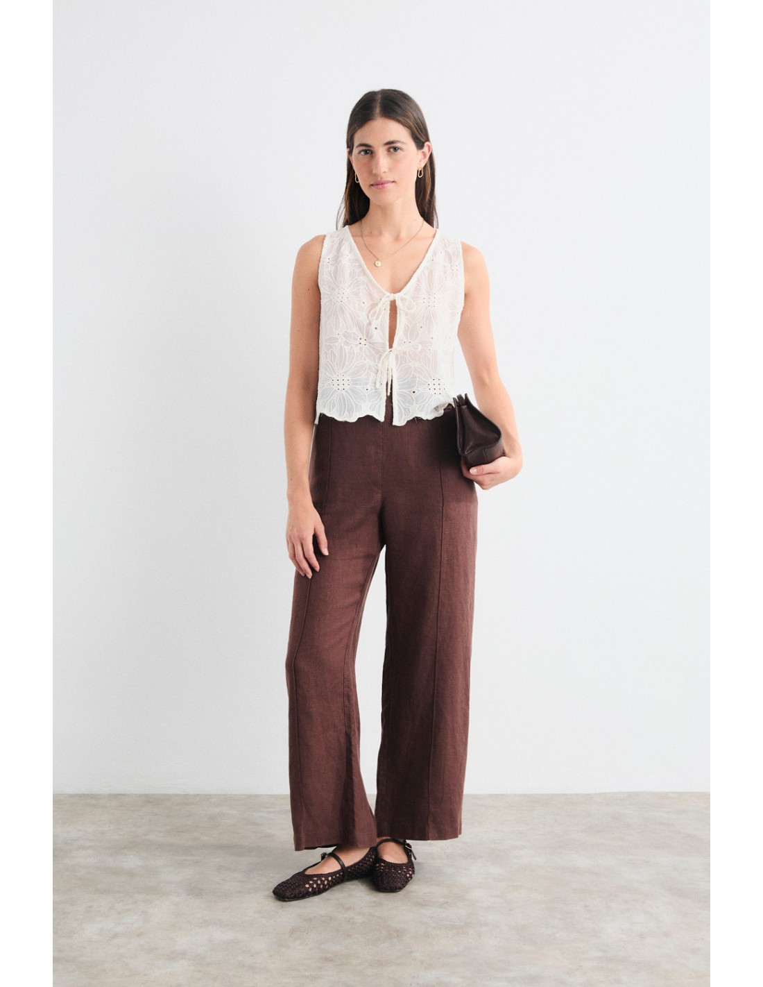Pantalon large en lin avec bord-côte sur le devant, ceinture plate sur le devant et élastique intégré à partir de la ligne de bord-côte. A combiner avec la chemise ou le top Aurora. Également disponible la robe en lin Aurora dans la même famille.