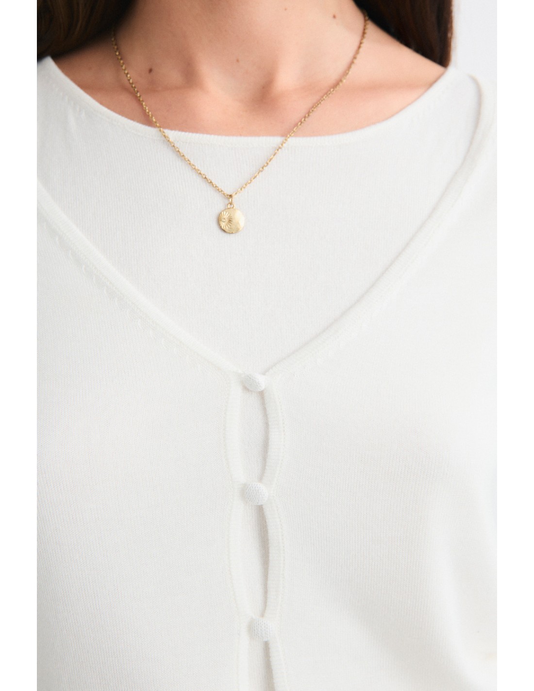 Cardigan court à manches longues et encolure en V, avec boutons doublés pour une finition délicate. Il fait partie de la famille Yakira, douce et polyvalente, tout comme le pull et le top dans le même fil.