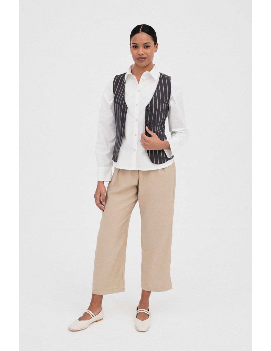 Gilet à rayures diplomatiques avec boutonnage frontal et bords arrondis. Il se distingue par le détail du nœud dans le dos, entièrement ajustable selon vos préférences. Il se combine avec le pantalon Vorota pour un look total.