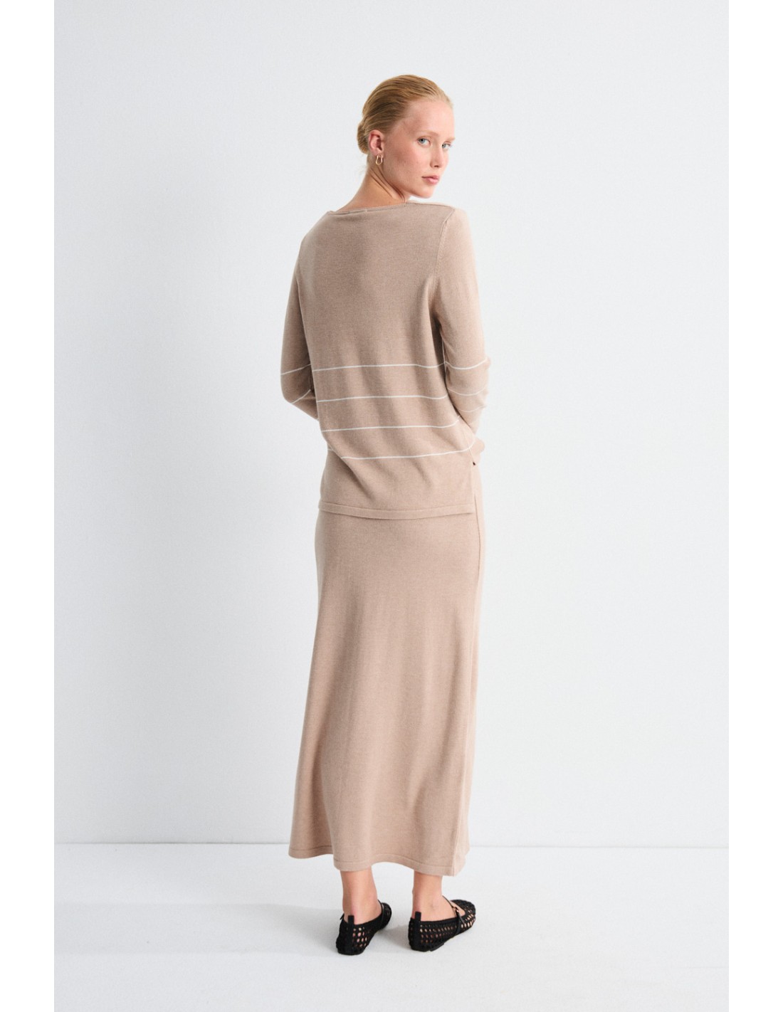 Pull en maille fine à col en V et rayures contrastées qui apportent une touche délicate. Son tissu doux et son tombé léger le rendent parfait à porter seul ou associé à la jupe Esterope.