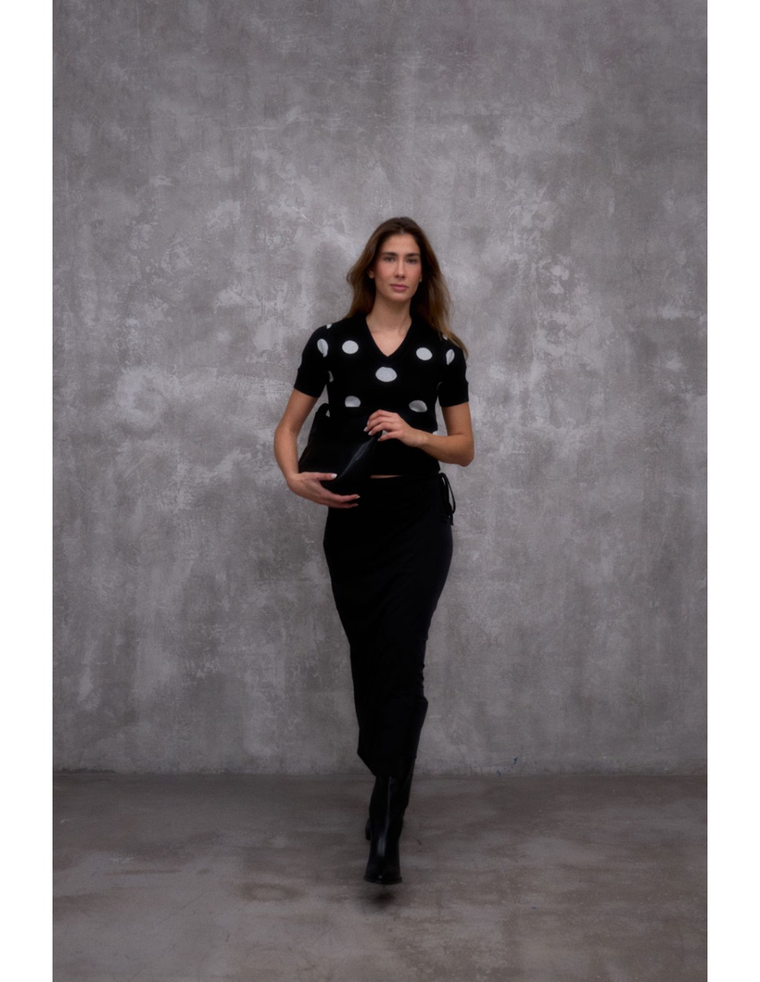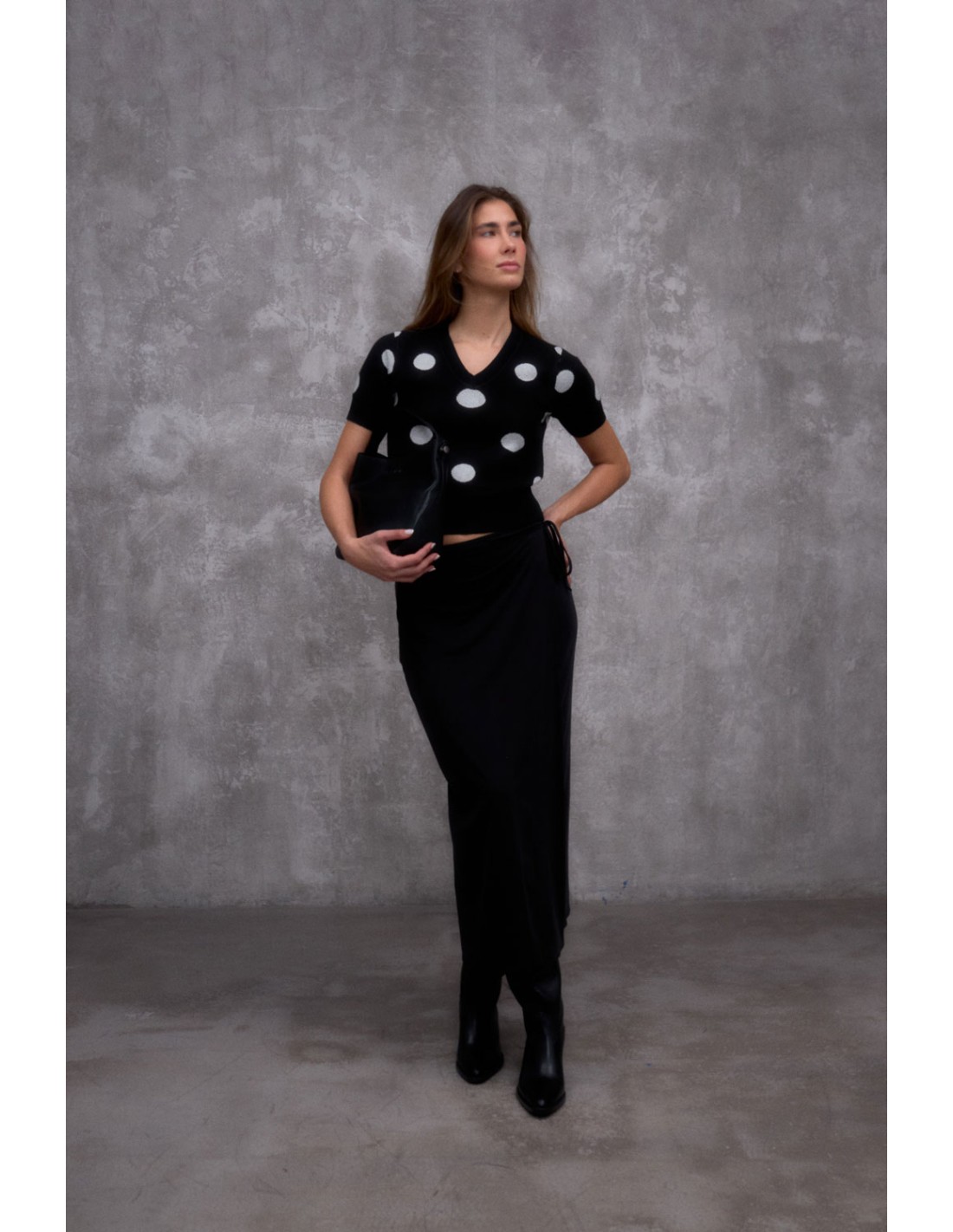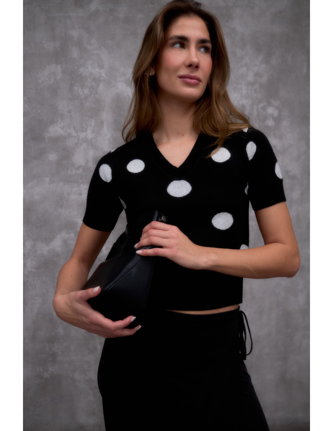 Pull à manches courtes et encolure en V en côtes, orné d'un motif jacquard à pois sur le corps et les manches. Il présente des finitions en côtes aux poignets et à l'ourlet qui lui confèrent une touche structurée et soignée.