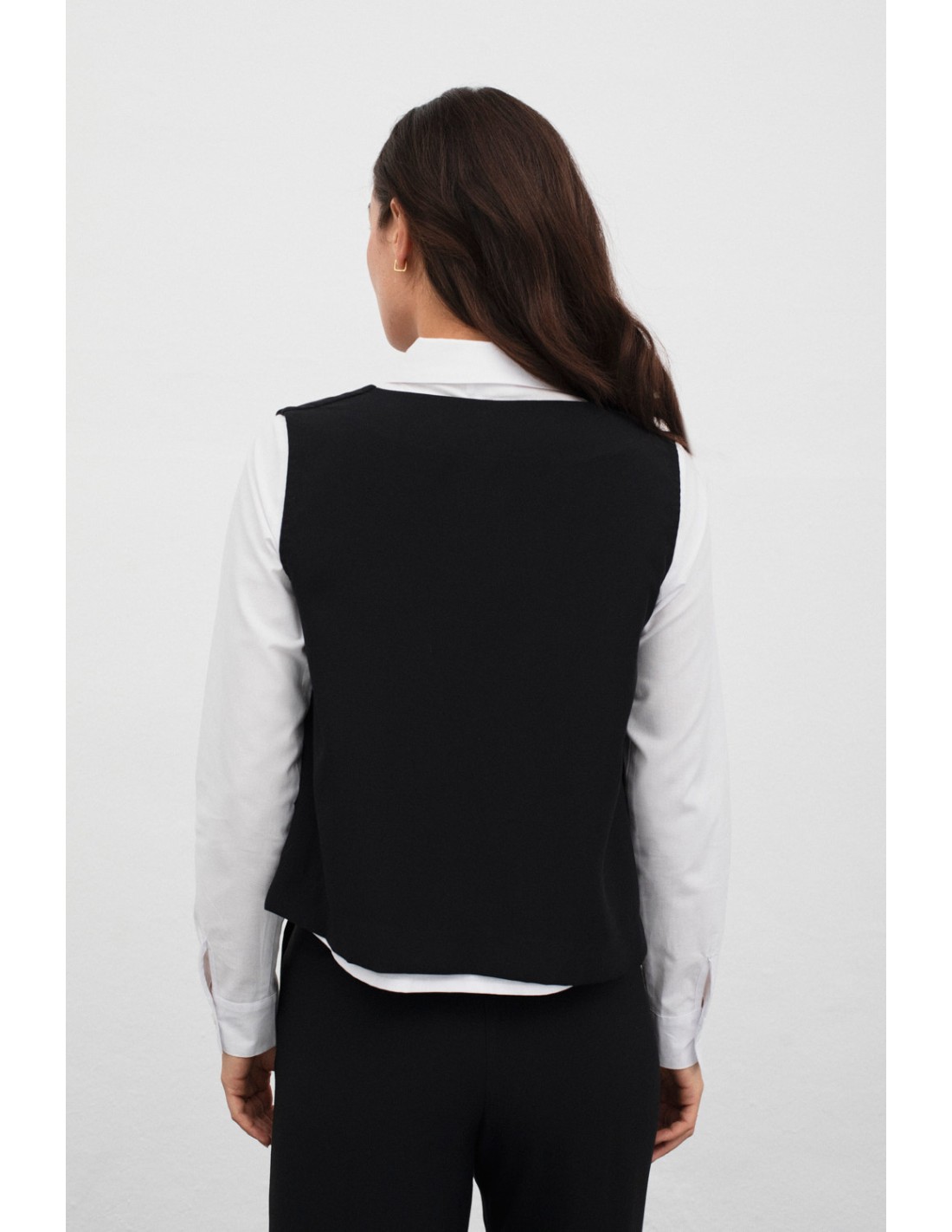 Gilet court avec fermeture latérale par bouton, décolleté en V et fausse poche sur le côté droit. Le côté droit se superpose au côté gauche et est légèrement plus long. À associer avec le pantalon Billwerder pour un total look.